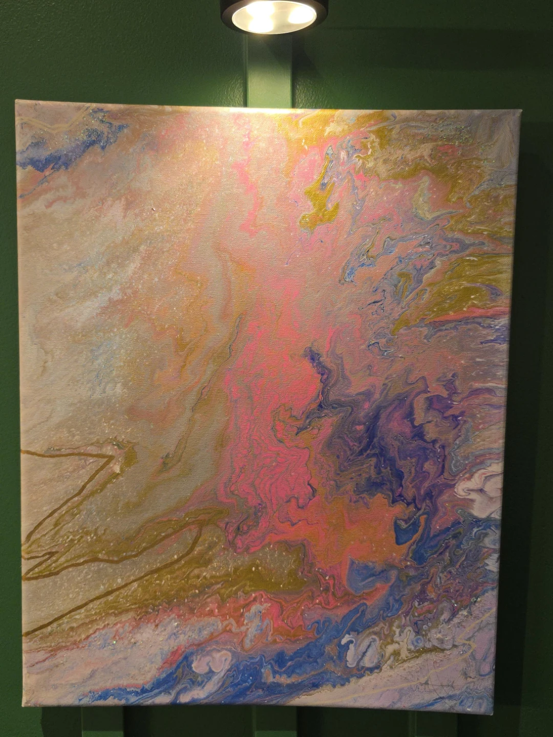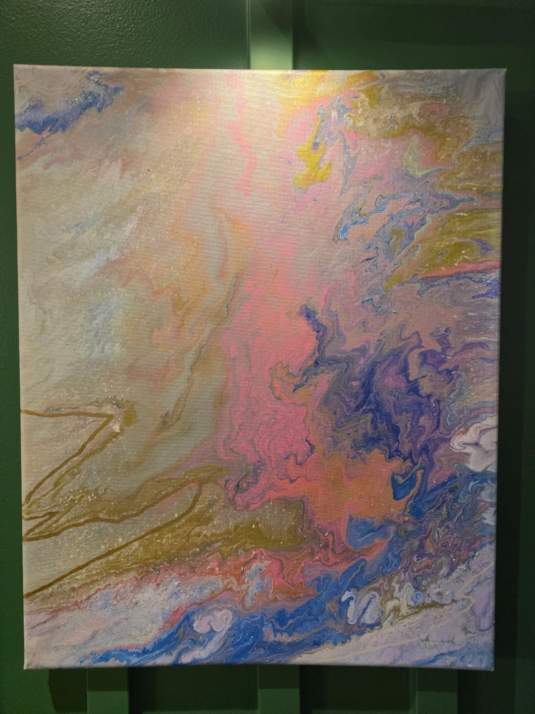 10I'm selling a unique abstract painting on canvas. It features a blend of pink, blue, gold, and white hues, creating a mesmerizing effect. This piece would add a touch of modern art to any room! Size: 16" x 20"