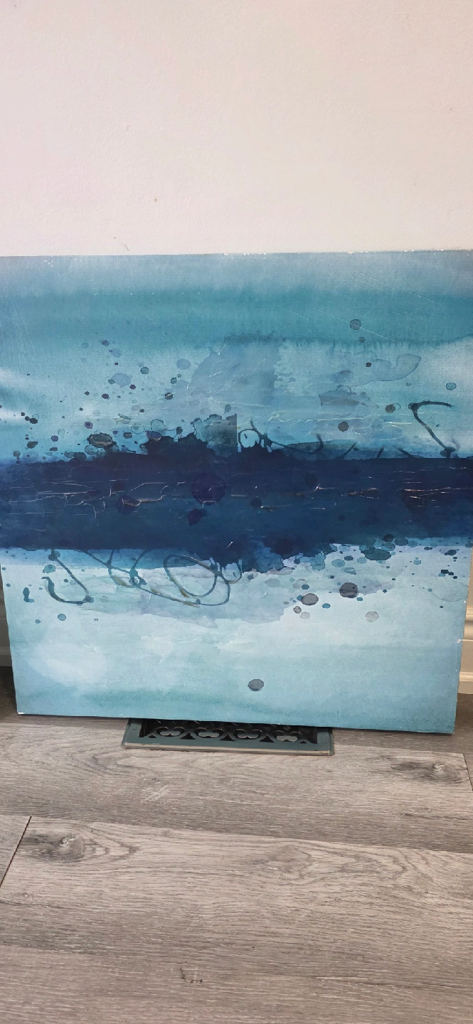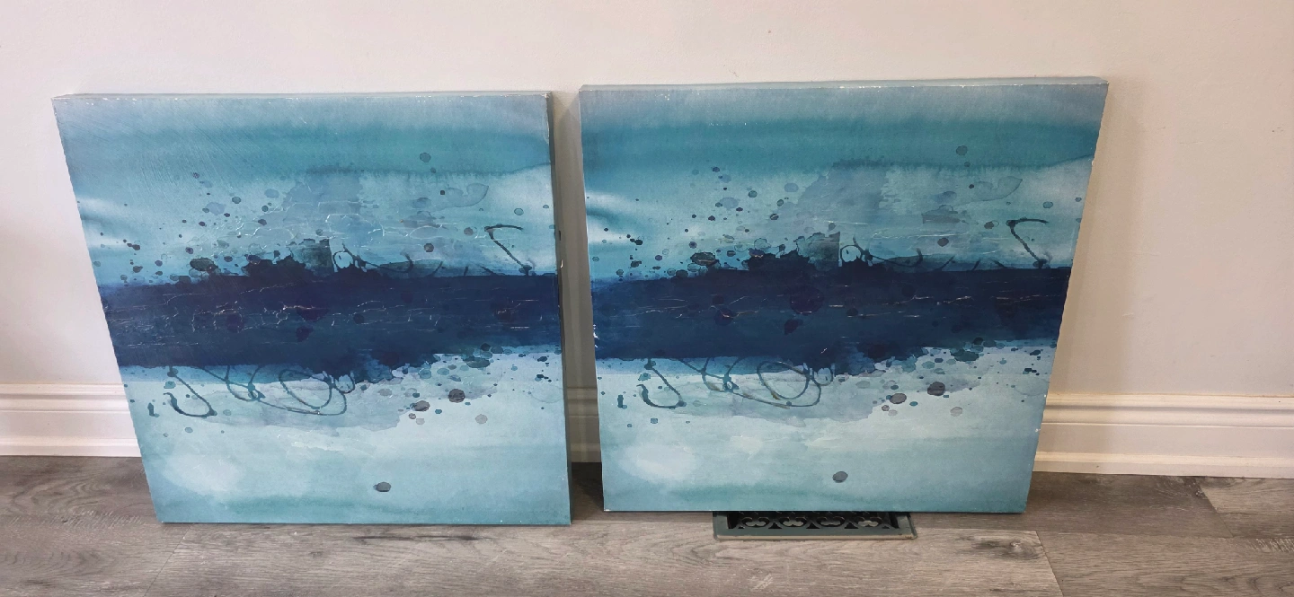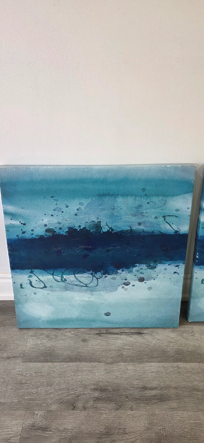 Selling a set of two abstract canvas wall art pieces. They feature a calming blue,turquoise and navy colour scheme, perfect for adding a touch of modern art to your home. They're in great condition and ready to hang!