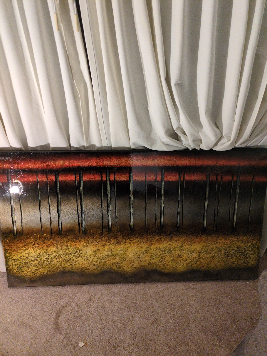 Selling an abstract forest scene wall art piece. It features a unique design with vertical tree-like figures and a blend of colours. This eye-catching piece would be a great addition to any home decor!