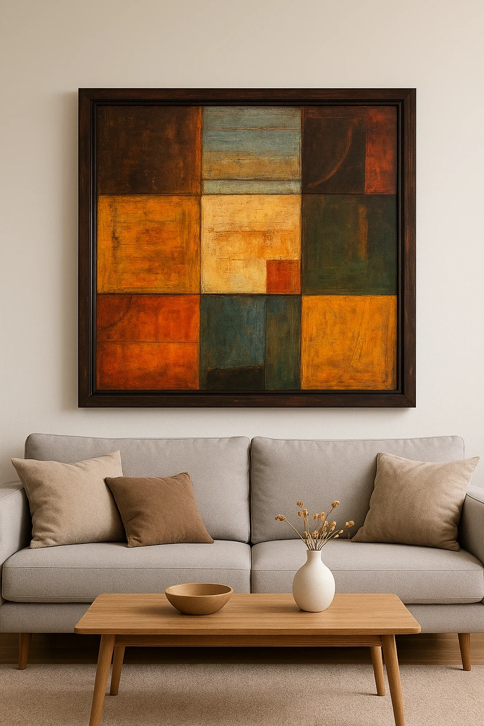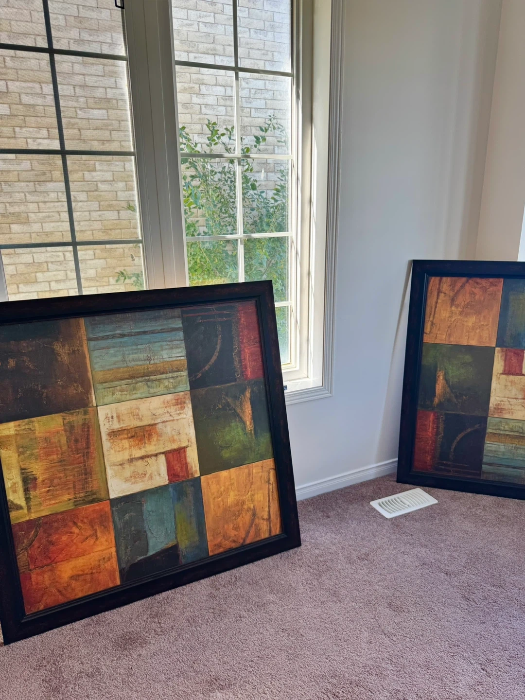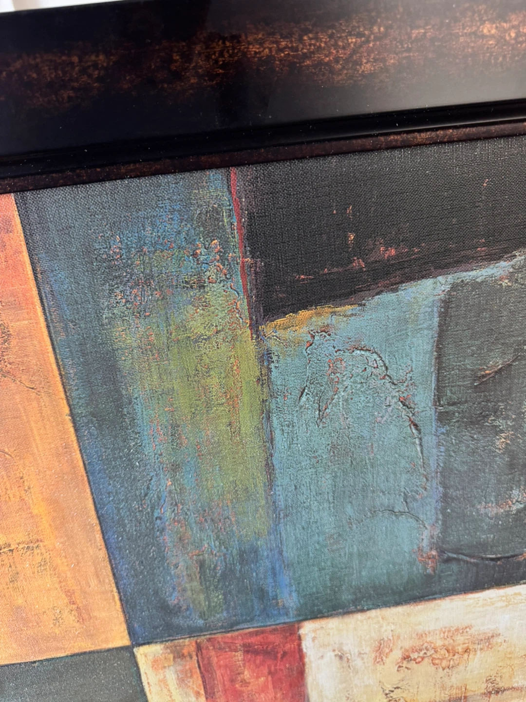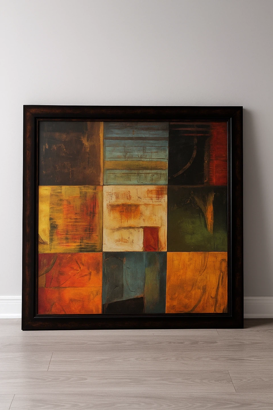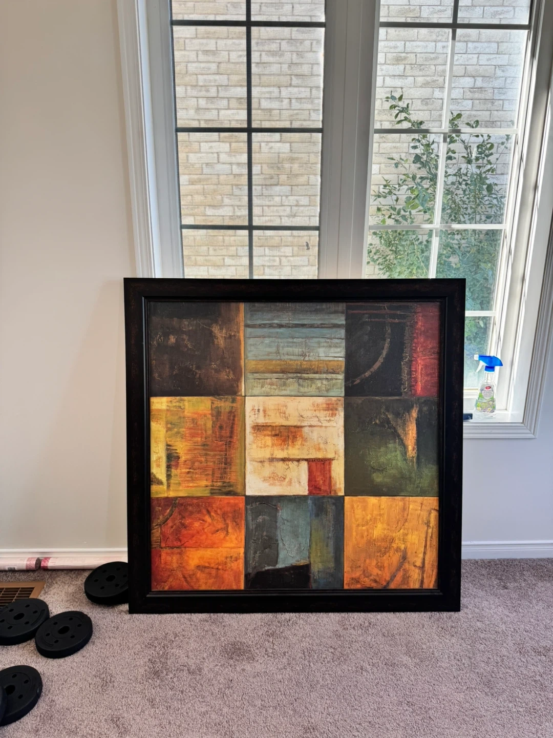 10Abstract Acrylic & Oil Painting β 100x100cm| Framed in Treated Red Cedar Wood π Pickup: Ajax| Free delivery within Durham Bring a touch of modern sophistication to your space with this stunning abstract geometric painting. Measuring 100x100 cm, this piece combines acrylic and oil on canvas, creating a rich mix of color, texture, and depth. The artwork features warm earthy tones β burnt orange, rustic red, olive green, deep brown, and soft blues β arranged in a balanced, layered composition that fits beautifully in living rooms, offices, or entryways. Details: Dimensions: 100cm x 100cm Medium: Acrylic and oil on canvas Frame: Hand-treated red cedar wood (dark, elegant finish) Style: Modern Abstract / Geometric Expressionism Condition: Excellent β ready to hang