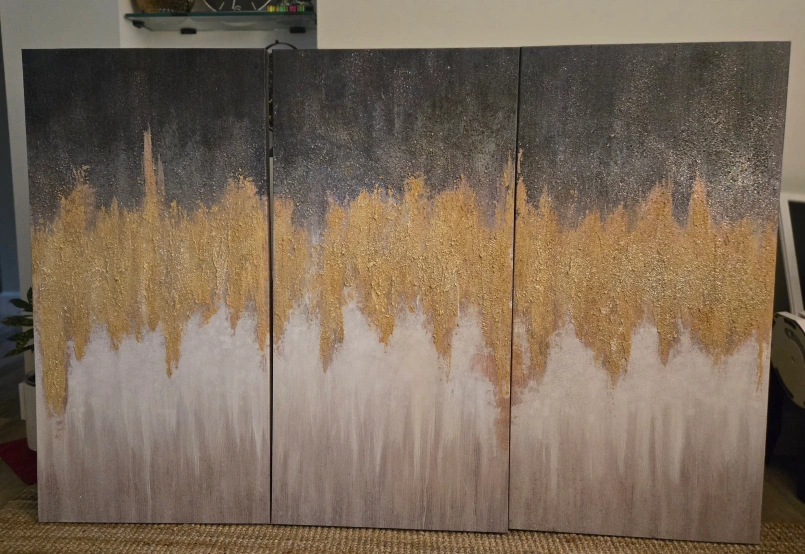 15Add a touch of modern elegance to your home with this stunning 3-panel abstract wall art. The piece features a beautiful blend of gold and grey tones, creating a sophisticated and eye-catching design. Perfect for living rooms, bedrooms, or hallways!
