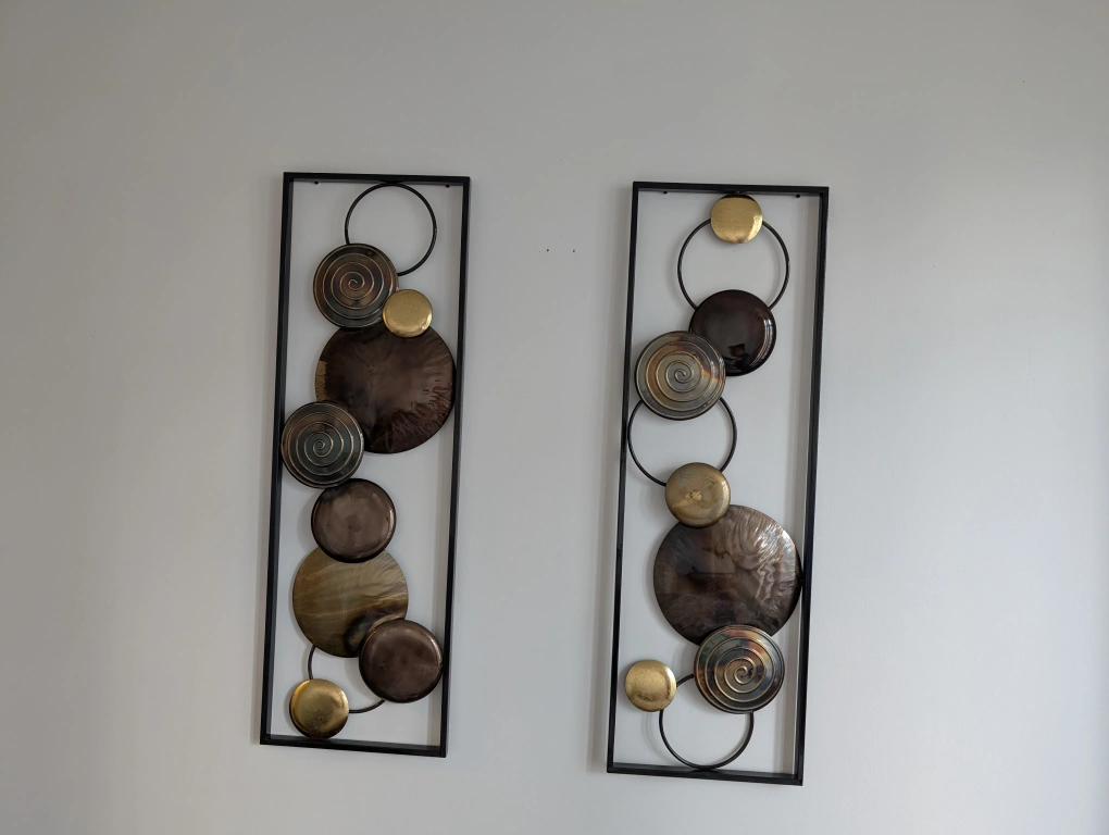 60Set of 2. These decorative pieces add a touch of artistic flair to any room. Each item features metal circles and spiral designs, creating a unique aesthetic that is sure to bring peace to your space.
