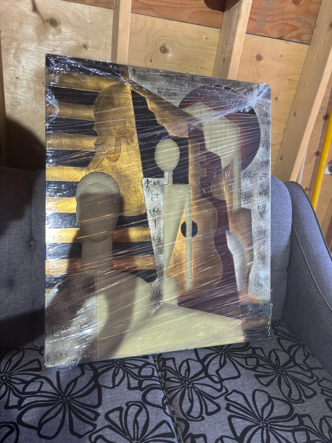 Unique abstract art piece featuring musical instruments. It's wrapped in plastic, ready to be displayed in your home!