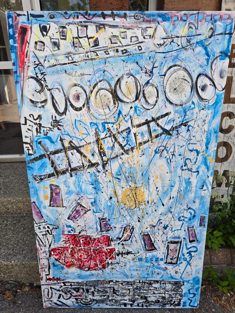 60This is an abstract painting on canvas. It features a mix of colours like blue, white, red, and black. It would be a great addition to any art collection or as a statement piece in your home