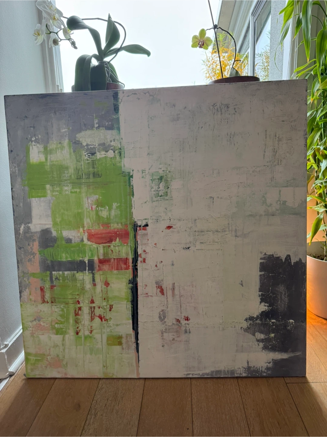 115Here's a unique original abstract painting that would add a modern touch to any room! The colours are a mix of green, white, and grey, creating a visually interesting piece. 36” x 36” I framed.