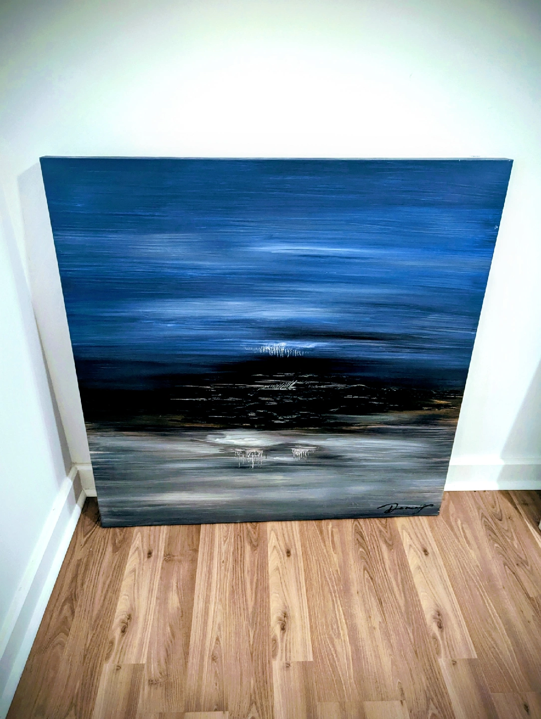 Abstract painting with blue and grey tones, signed by the artist. It's a beautiful piece that would add a touch of sophistication to any room