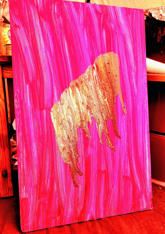 Unique abstract elephant pour painting featuring bold pink strokes and a textured gold design. It would add a pop of colour to any room!