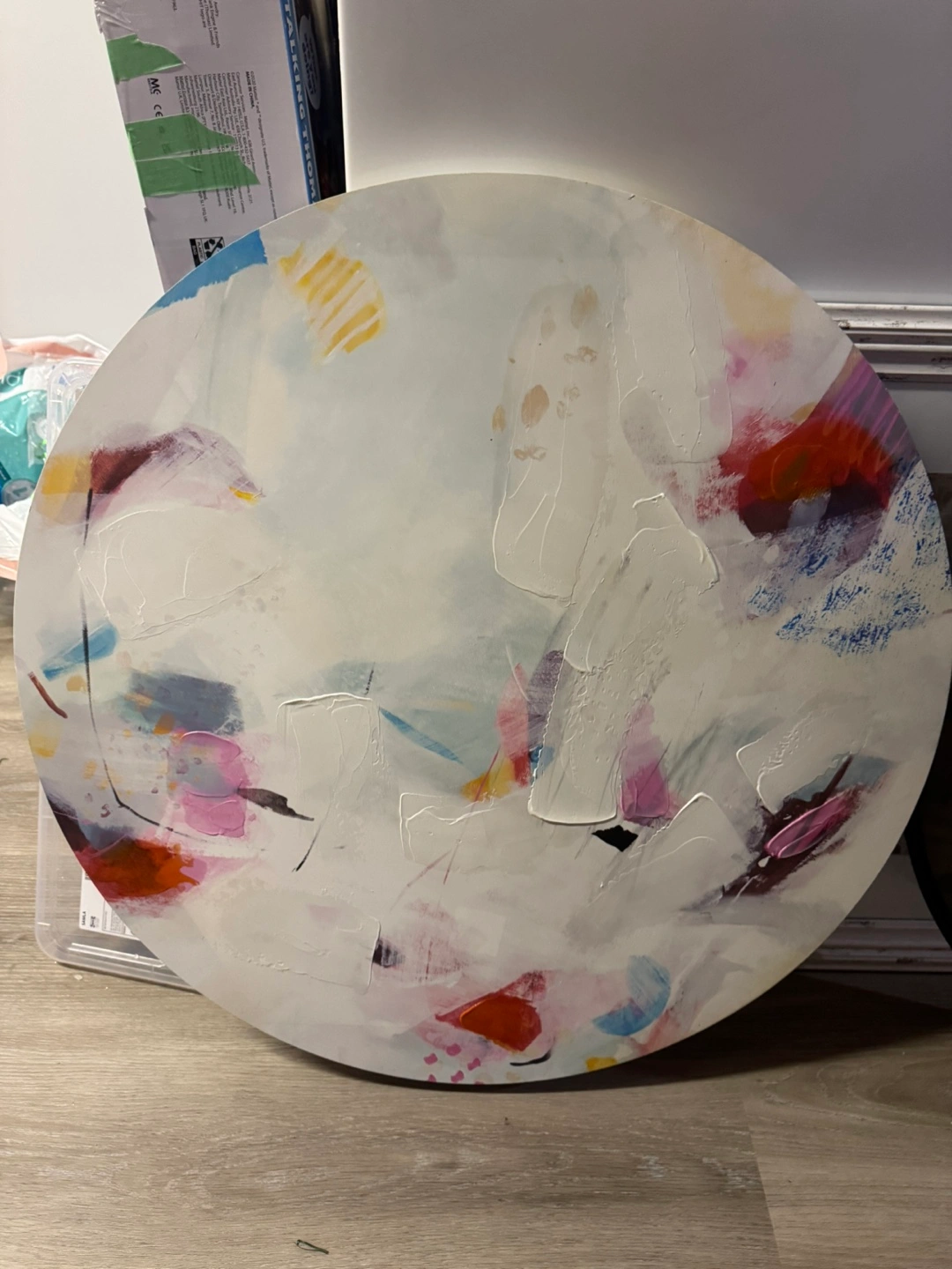 I have a round canvas painting for sale. It features an abstract design with various colours and textures. It would look great in any room!