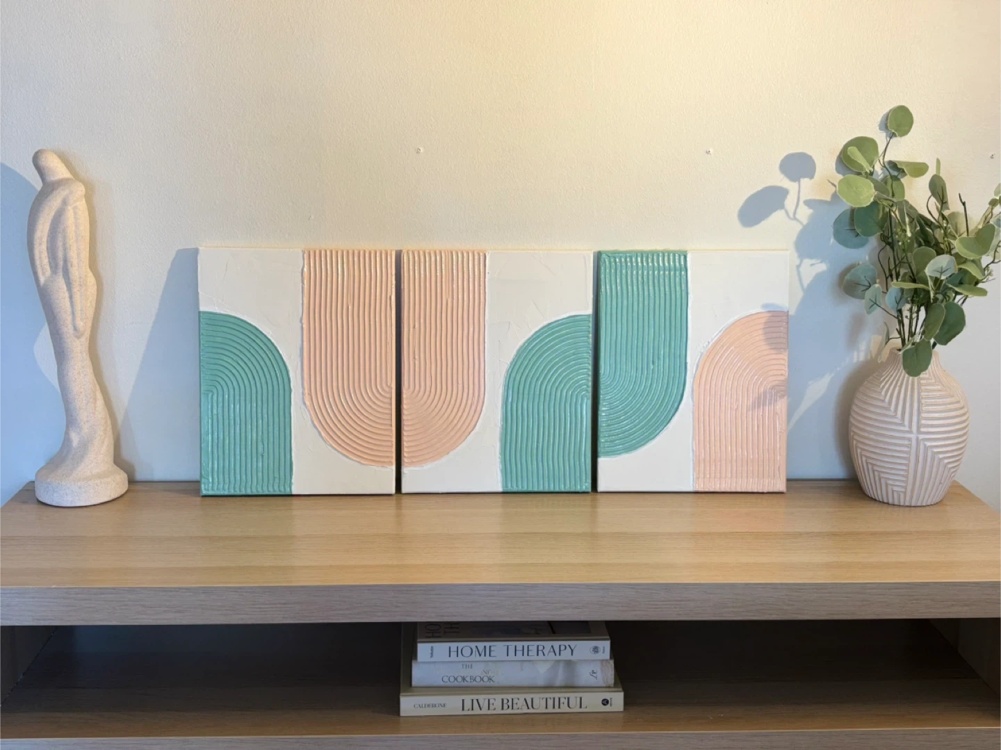 10Looking to add a touch of modern art to your space? I'm selling this set of 4 abstract textured wall art pieces. The colours are a lovely combination of peach and mint, perfect for a calming and stylish vibe. They're in great condition and ready to find a new home! MEASUREMENTS: 14 inches by 11 inches Smoke free and pet free home
