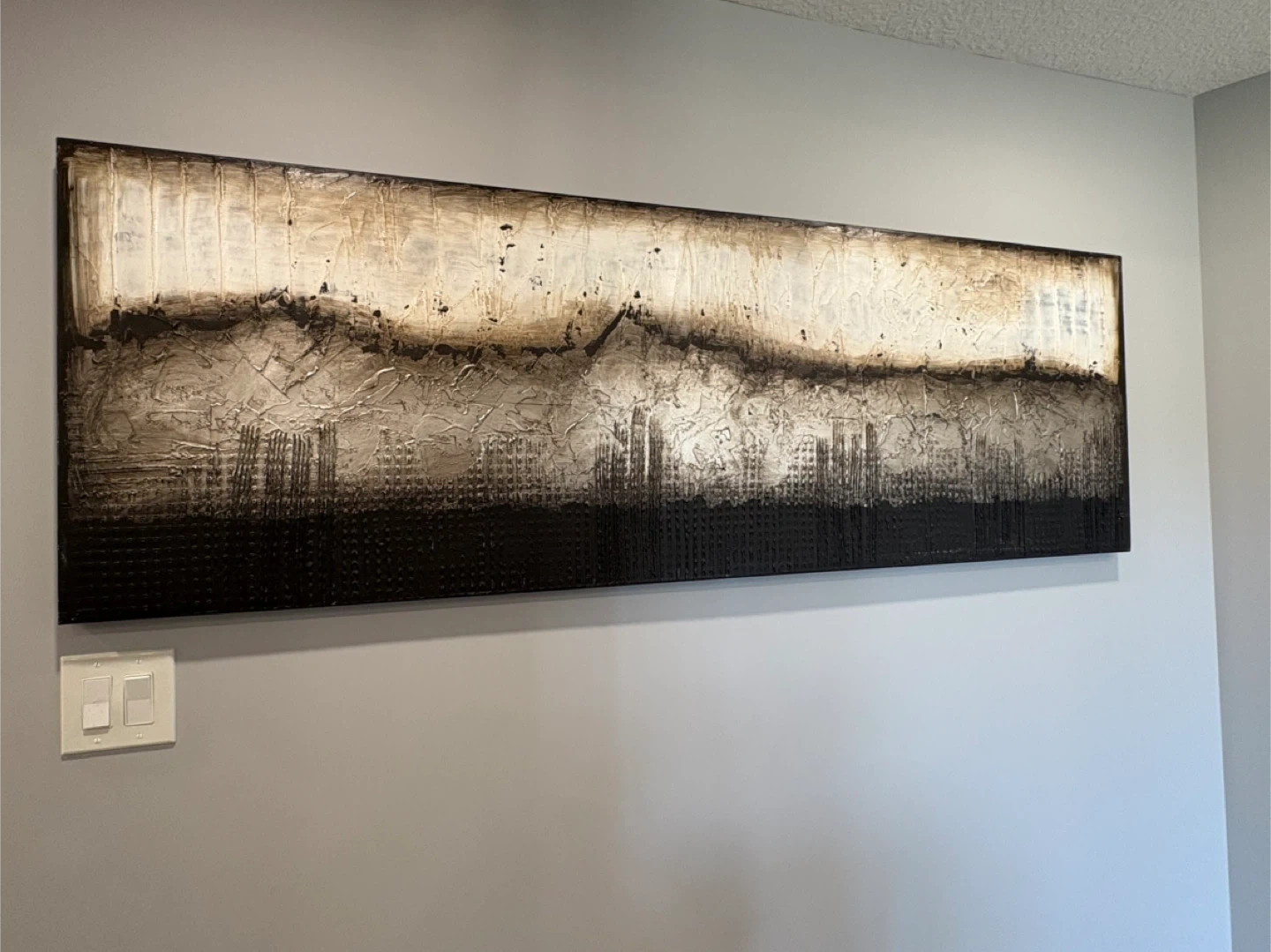 95Unique abstract wall art piece with neutral tones. Adds a touch of modern style to any room! The artwork features textured details and a blend of black, white, and beige shades. Perfect for adding visual interest to your living space or office