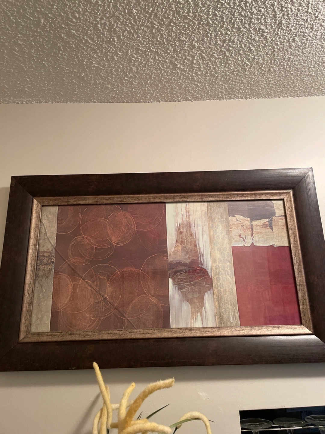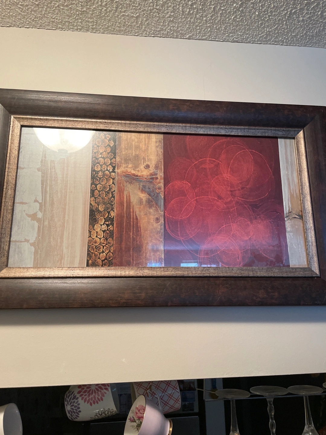 78Large framed abstract print. Features muted reds, browns, and creams. Perfect for a modern home. Good condition.