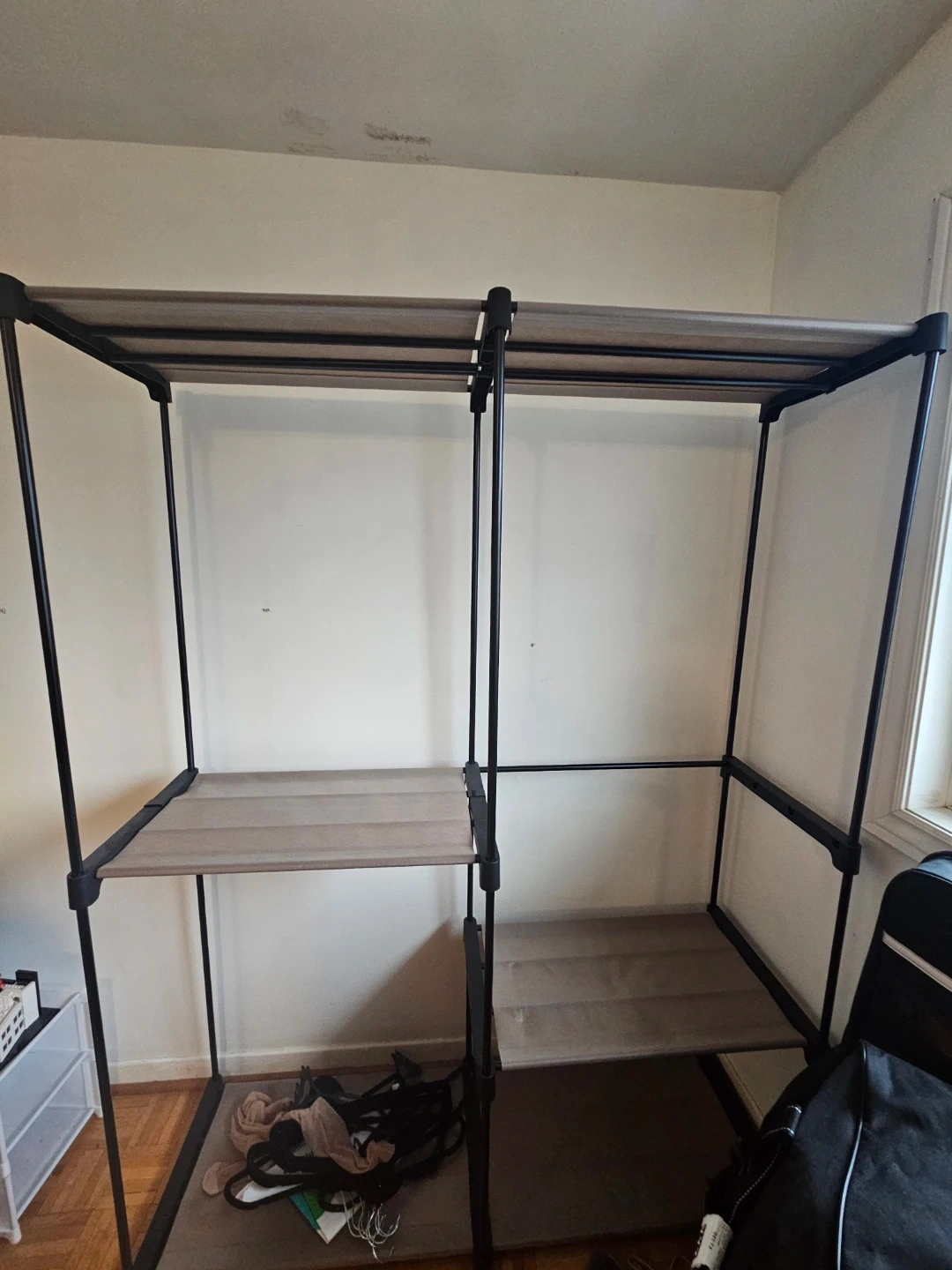 This portable clothing rack offers a convenient way to store your garments. It's constructed with a metal frame and wood-effect shelves. Perfect for keeping clothes organized in a bedroom or closet space.