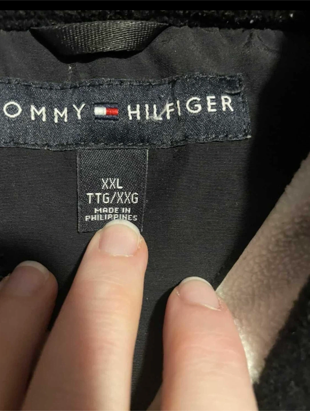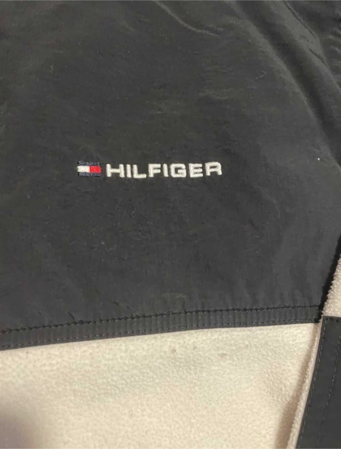 This is a Tommy Hilfiger zip-up fleece jacket in black and cream. It's a size XXL. Keeps you warm on chilly days!