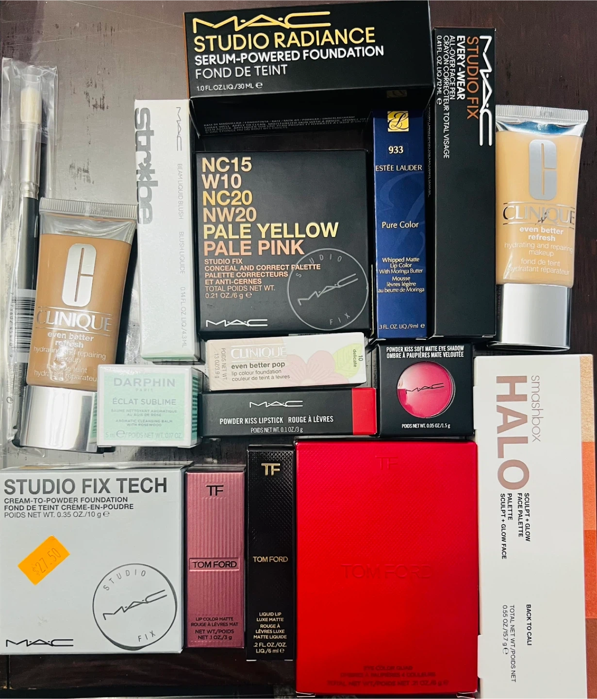 This bundle includes Tom ford eye color Quad, MAC Studio Radiance Serum-Powered Foundation, MAC Studio Fix Conceal and Correct Palette, and other makeup items. Details include MAC Studio Fix Tech Cream-to-Powder Foundation, Clinique Even Better Refresh foundation, and Tom Ford lipsticks. It's a great selection for makeup enthusiasts!