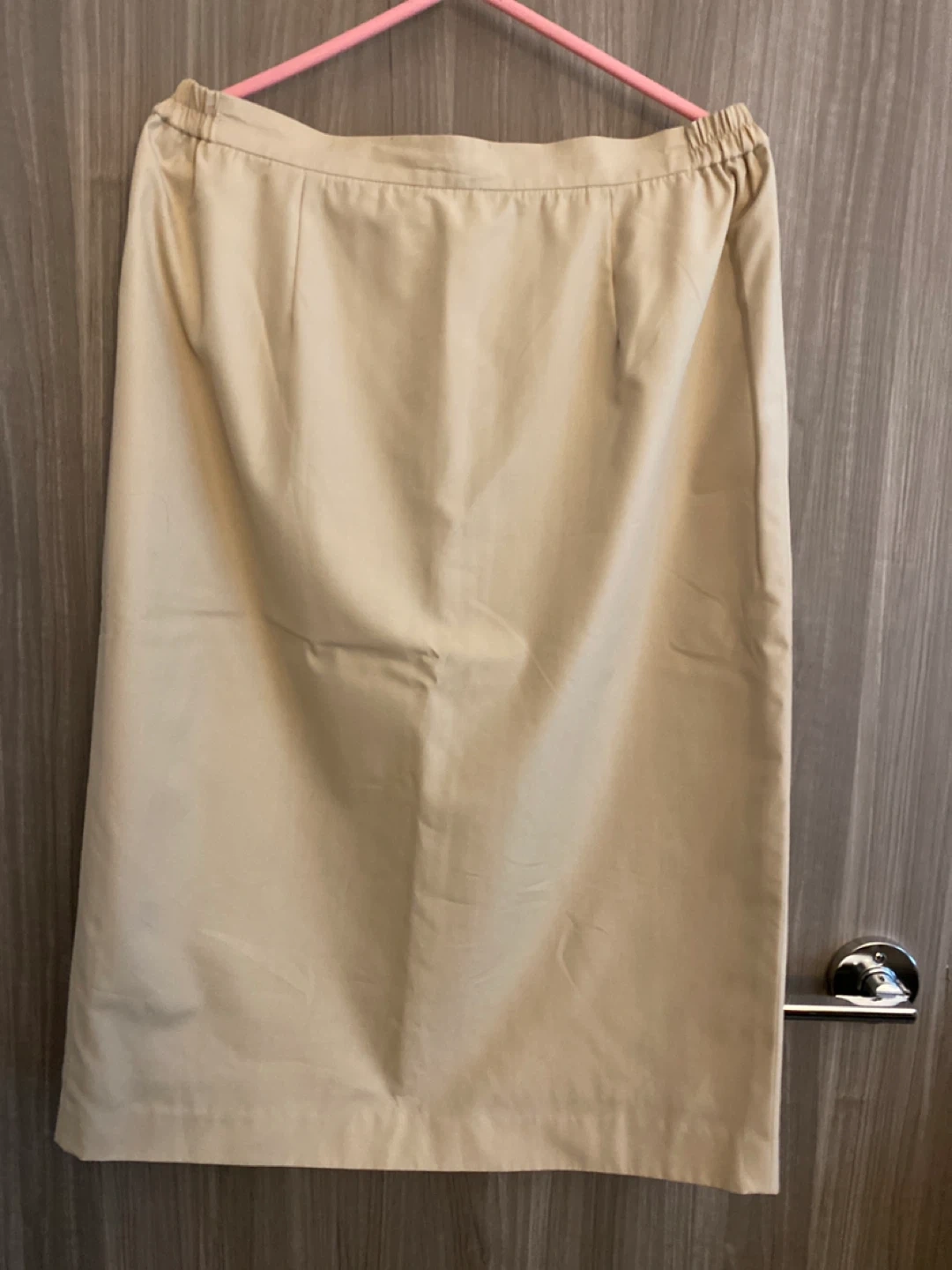 A simple beige midi skirt. It features an elastic waistband at the back and a zippered closure. The fabric appears to be a blend, offering a nice drape. This skirt is a versatile piece for various occasions.