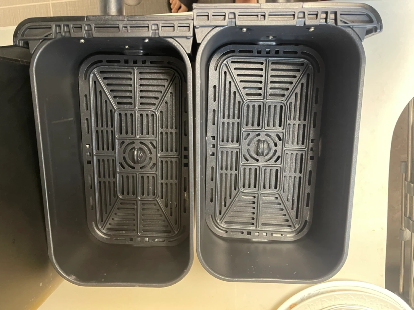 This extra-large 11QT air fryer comes with two independent 5.5QT baskets, allowing you to cook two different foods at the same time with separate settings — perfect for meals like fries and chicken simultaneously.