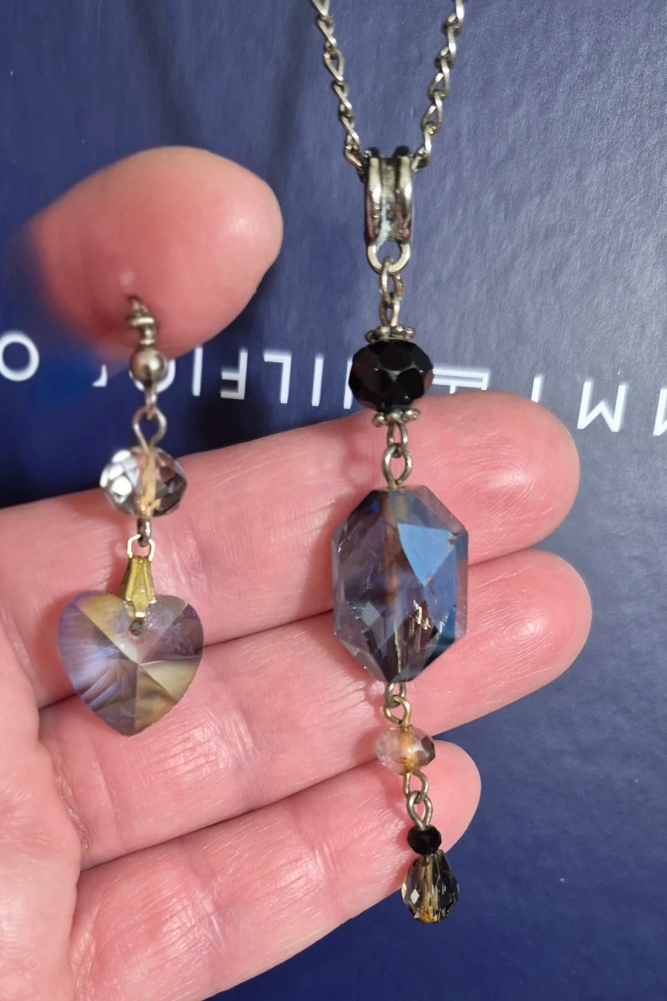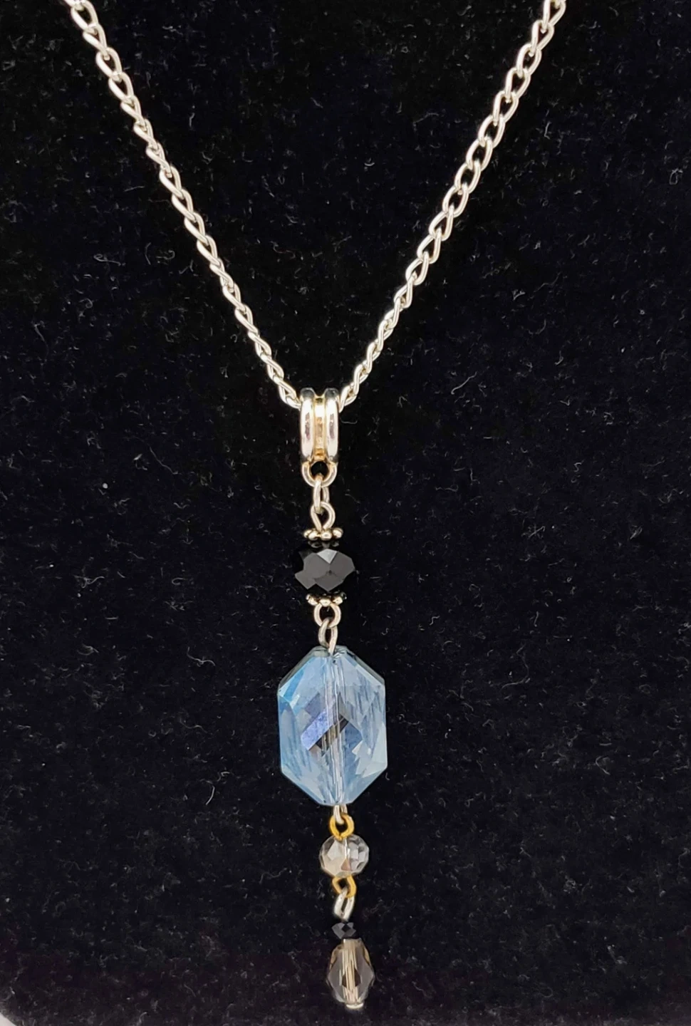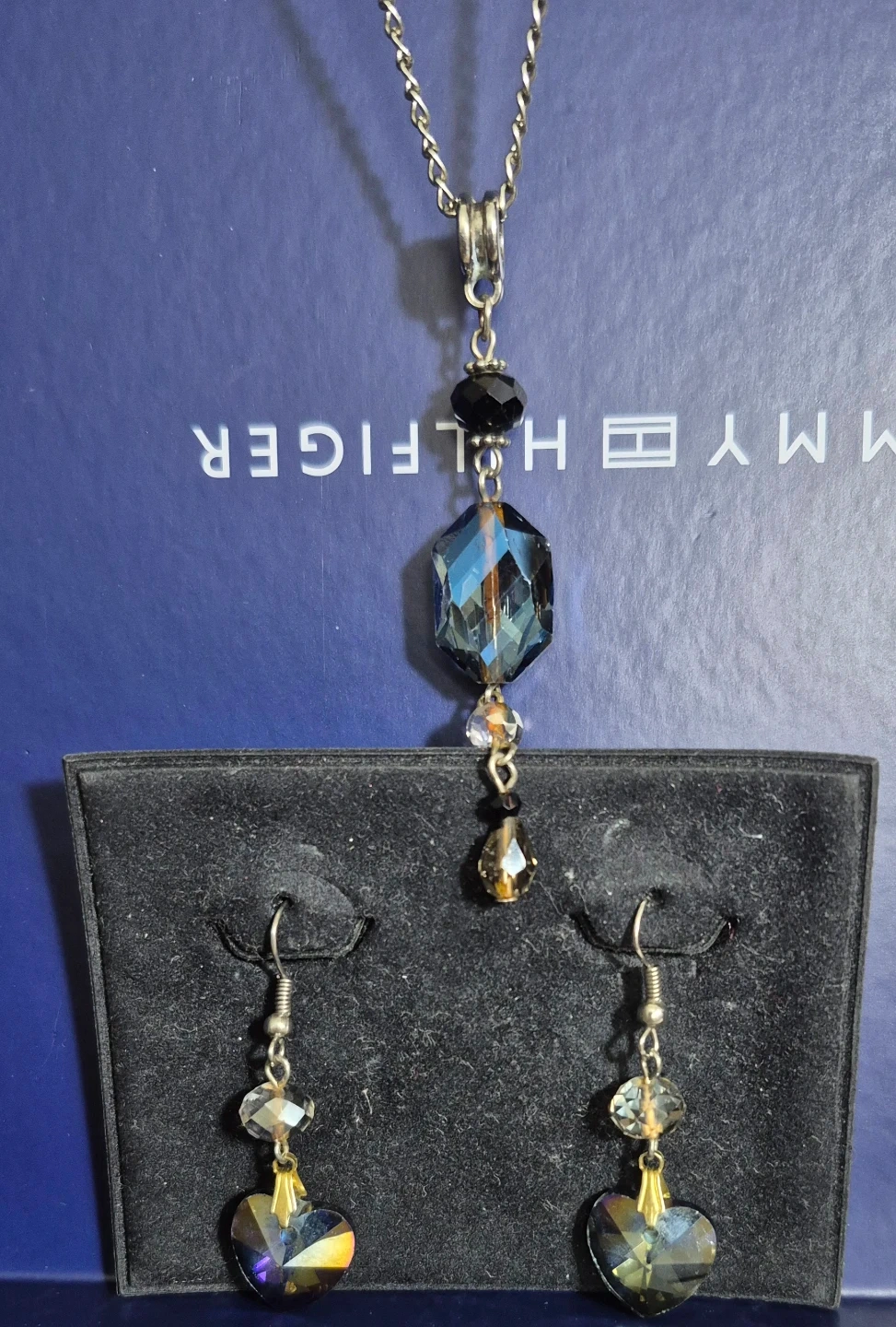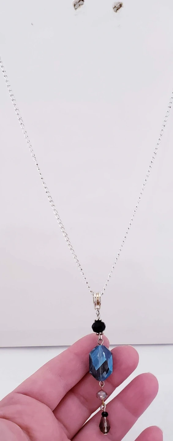 This set includes a necklace with a faceted blue hexagon pendant and matching earrings featuring heart-shaped charms. The jewellery is embellished with black and clear beads. It's a lovely accessory for everyday wear or special occasions!