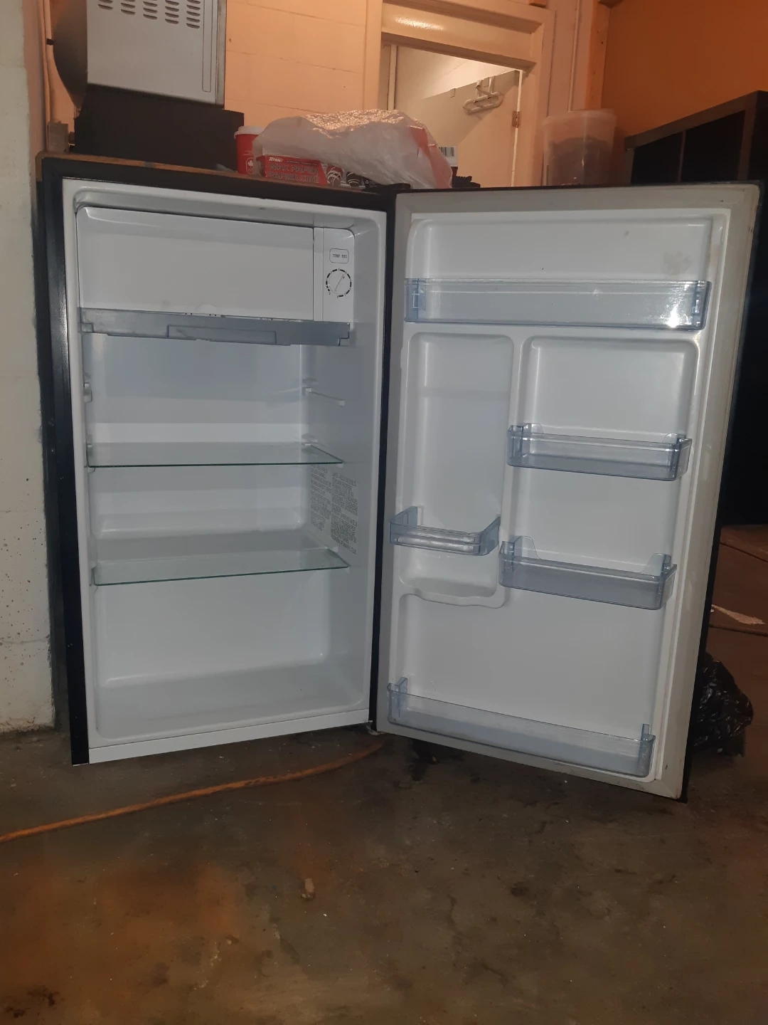 Compact mini fridge with adjustable shelves. It's perfect for dorm rooms or small spaces. Features a reversible door.