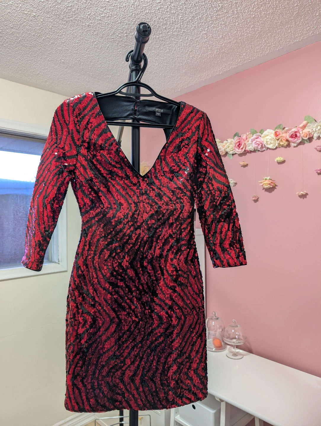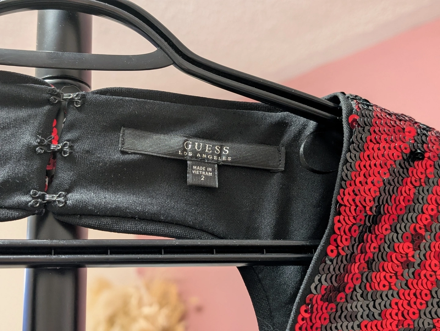 Looking to sell this gorgeous GUESS dress! It features a striking red and black sequin pattern, perfect for a night out.