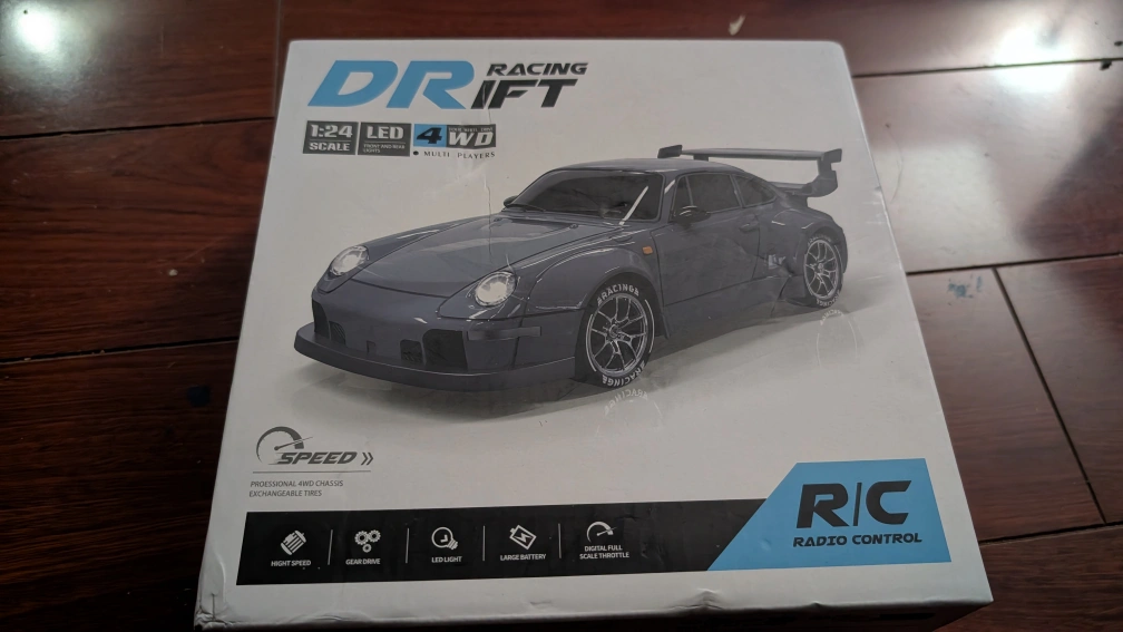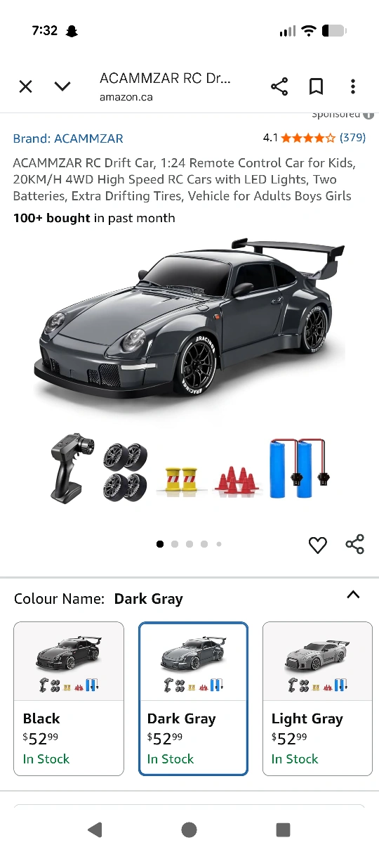 Selling an ACAMMZAR RC Drift Car in dark grey. It's a 1:24 scale model with LED lights and 4WD. It's designed for high speed drifting and comes with extra drifting tires. Originally bought for $70