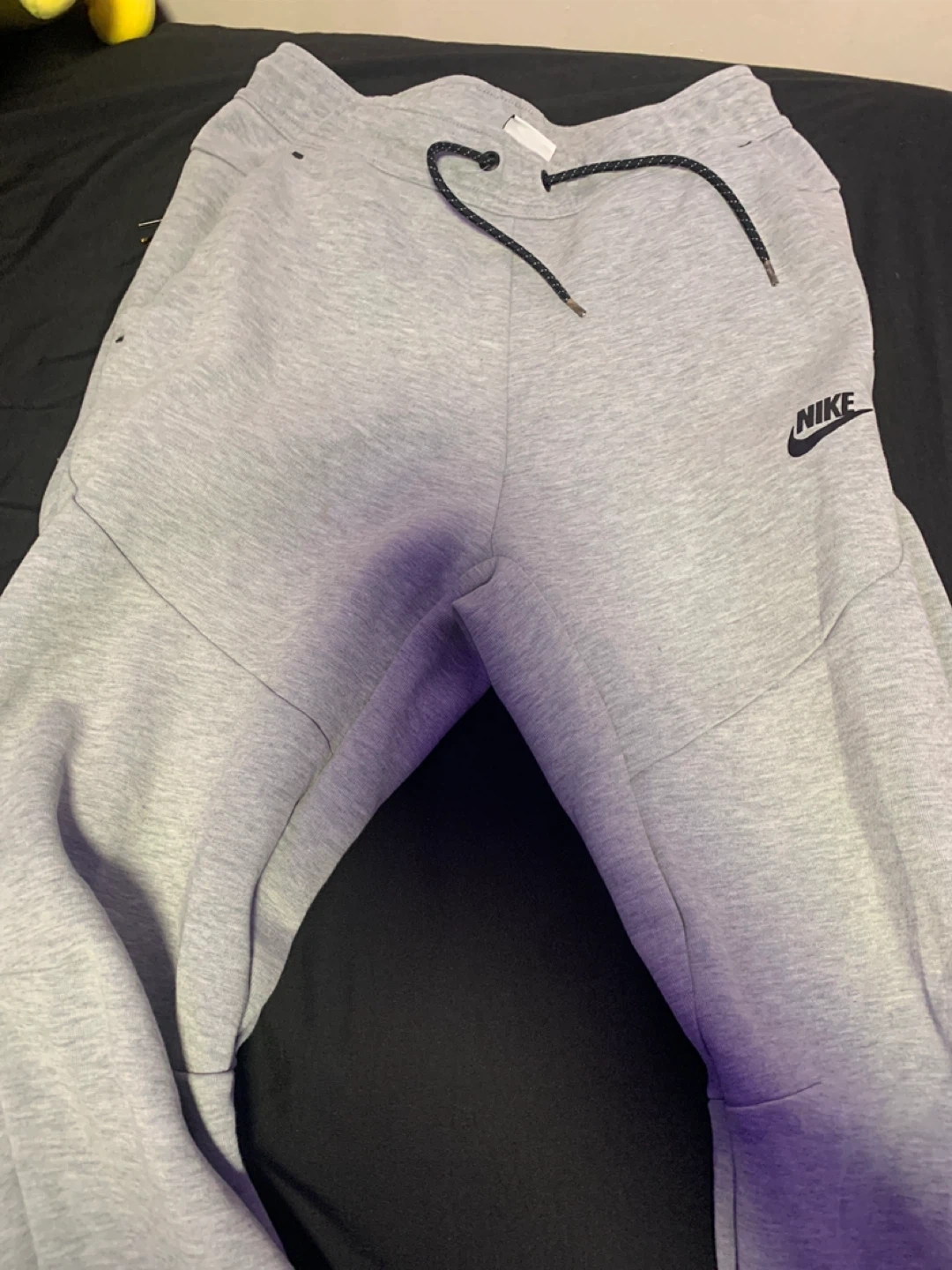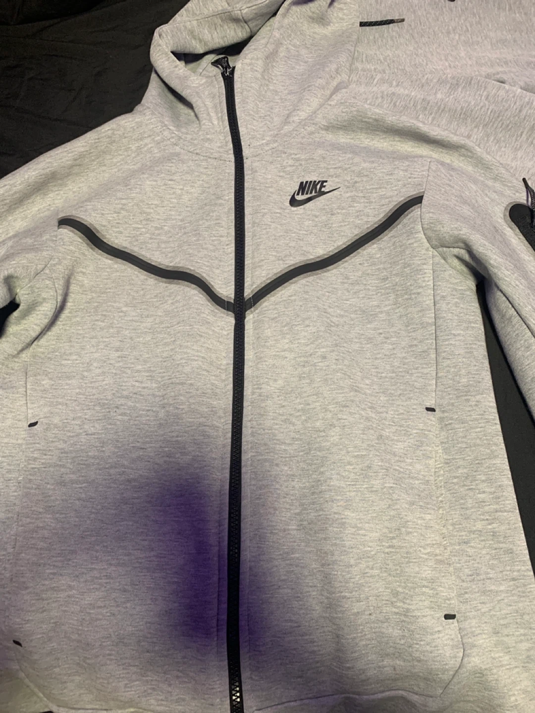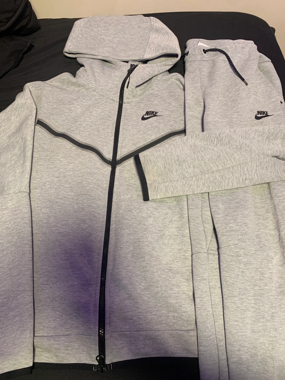 This is a grey Nike Tech Fleece set, including joggers and a zip-up hoodie. It's made with a comfortable fleece material. Perfect for casual wear!