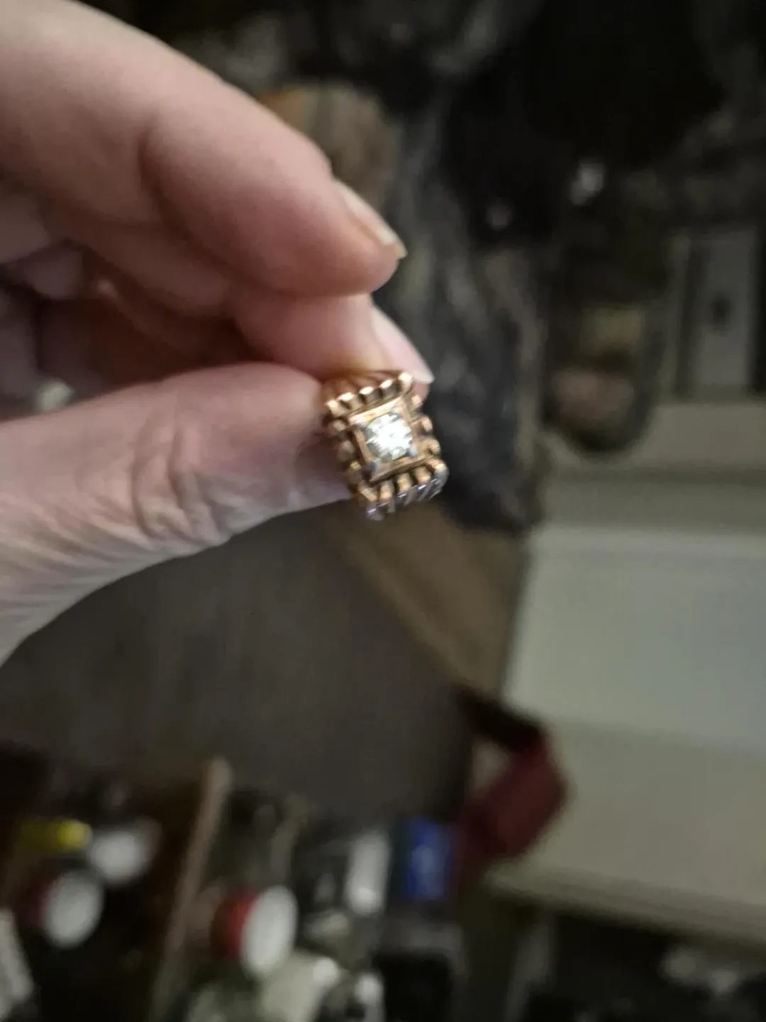 This ring features a gold-toned band with a decorative, square-set centrepiece. It showcases a single diamond that catches the light. This unique piece is perfect for adding a touch of sparkle to any outfit!