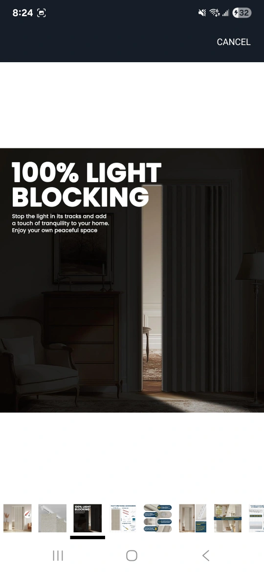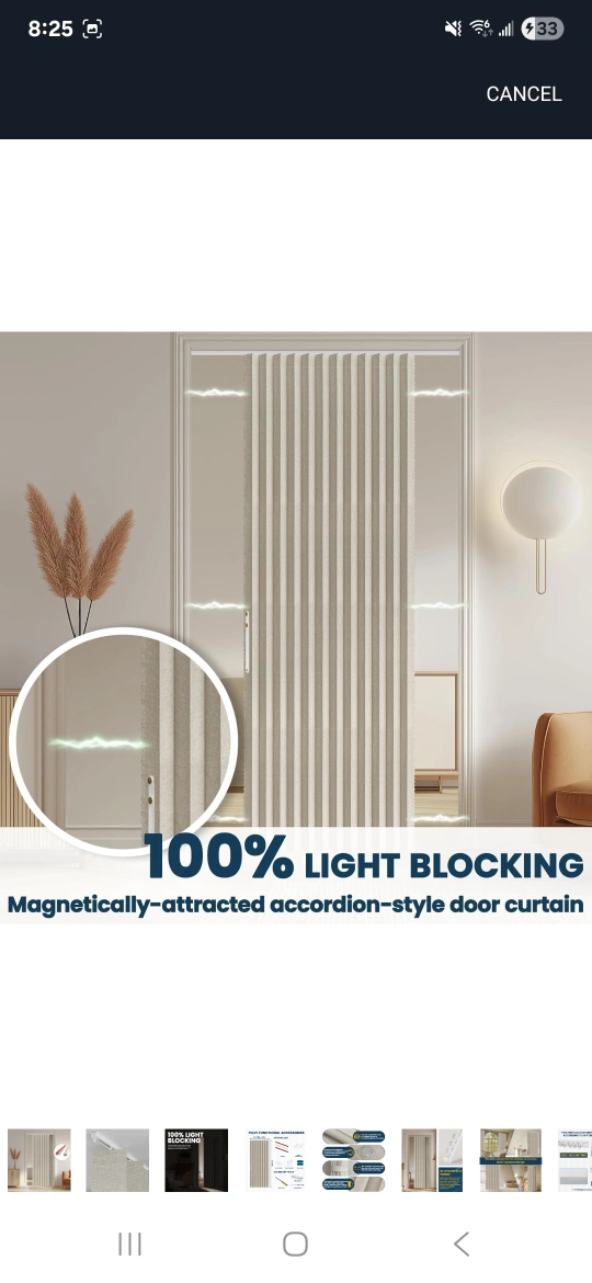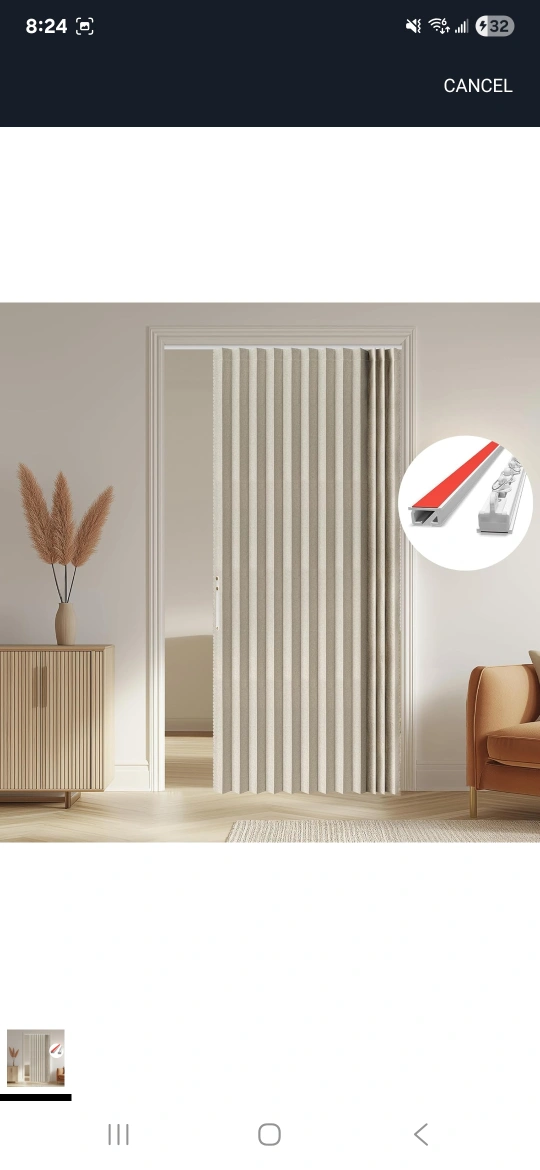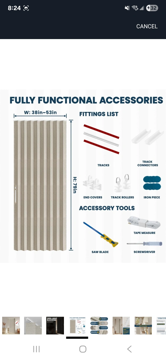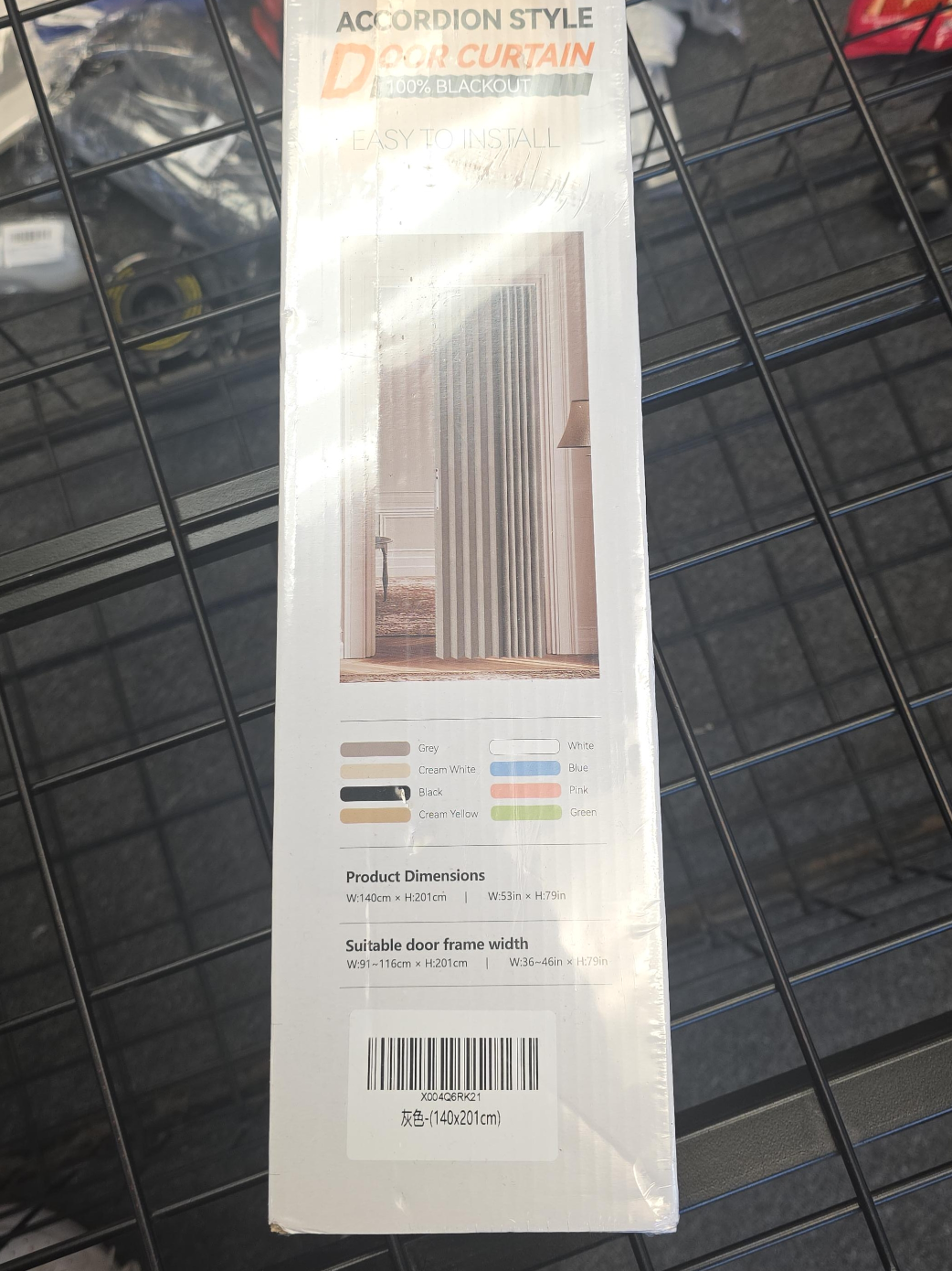 This is an accordion style door curtain that provides 100% blackout! It's easy to install and comes in grey. Product Dimensions: - W:140cm x H:201cm - W:53in x H:79in Suitable door frame width: - W:91-116cm x H:201cm - W:36-46in x H:79in It also comes with fully functional accessories, including tracks, track connectors, end covers, track rollers, and an iron piece! unopened box