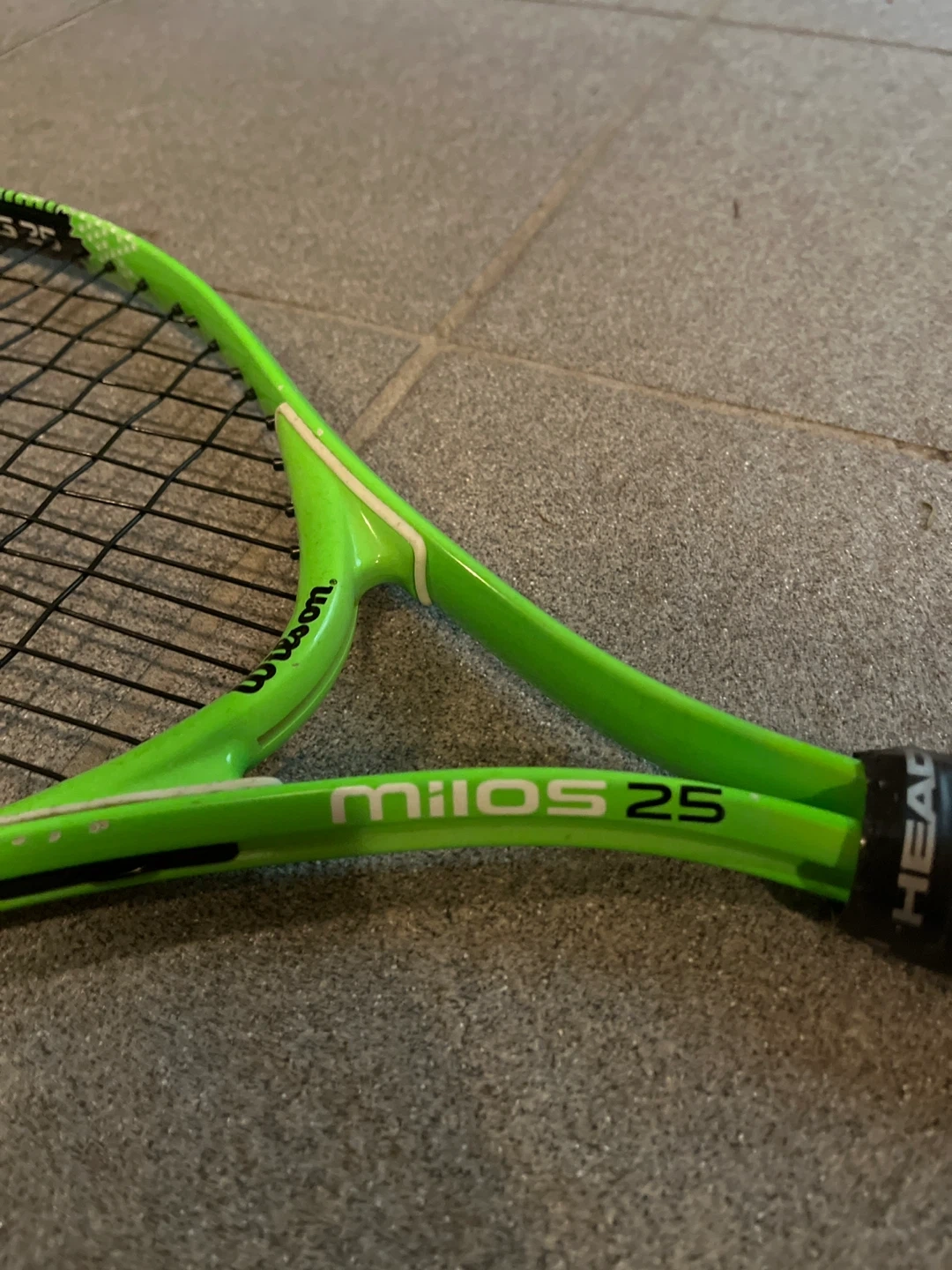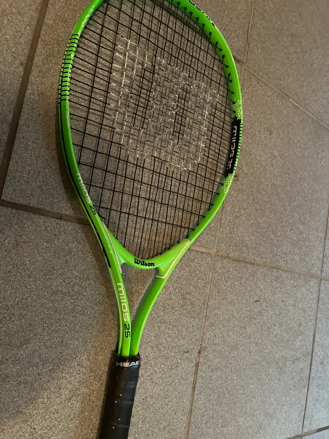 Selling a Wilson Milos 25 junior tennis racquet. It's in used condition with some wear and tear, as shown in the pictures. Perfect for young players learning the game! Has scratches near top but no physical damage!