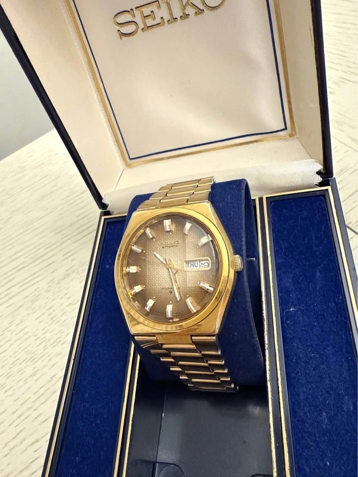 Classic Seiko automatic men’s gold-tone vintage watch with textured champagne dial and matching gold bracelet.