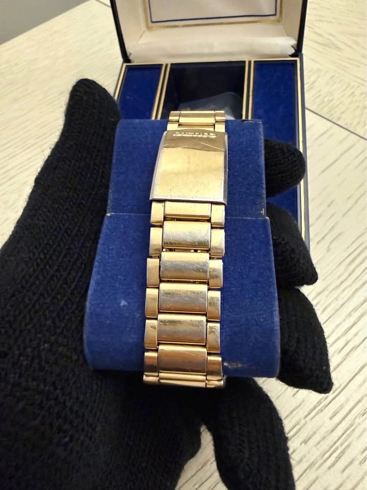 Watch is running and keeping time. Overall good vintage condition with visible wear to gold plating on case and bracelet consistent with age. Dial has a nice textured finish with some spotting/patina typical of vintage pieces. Crystal shows surface marks.