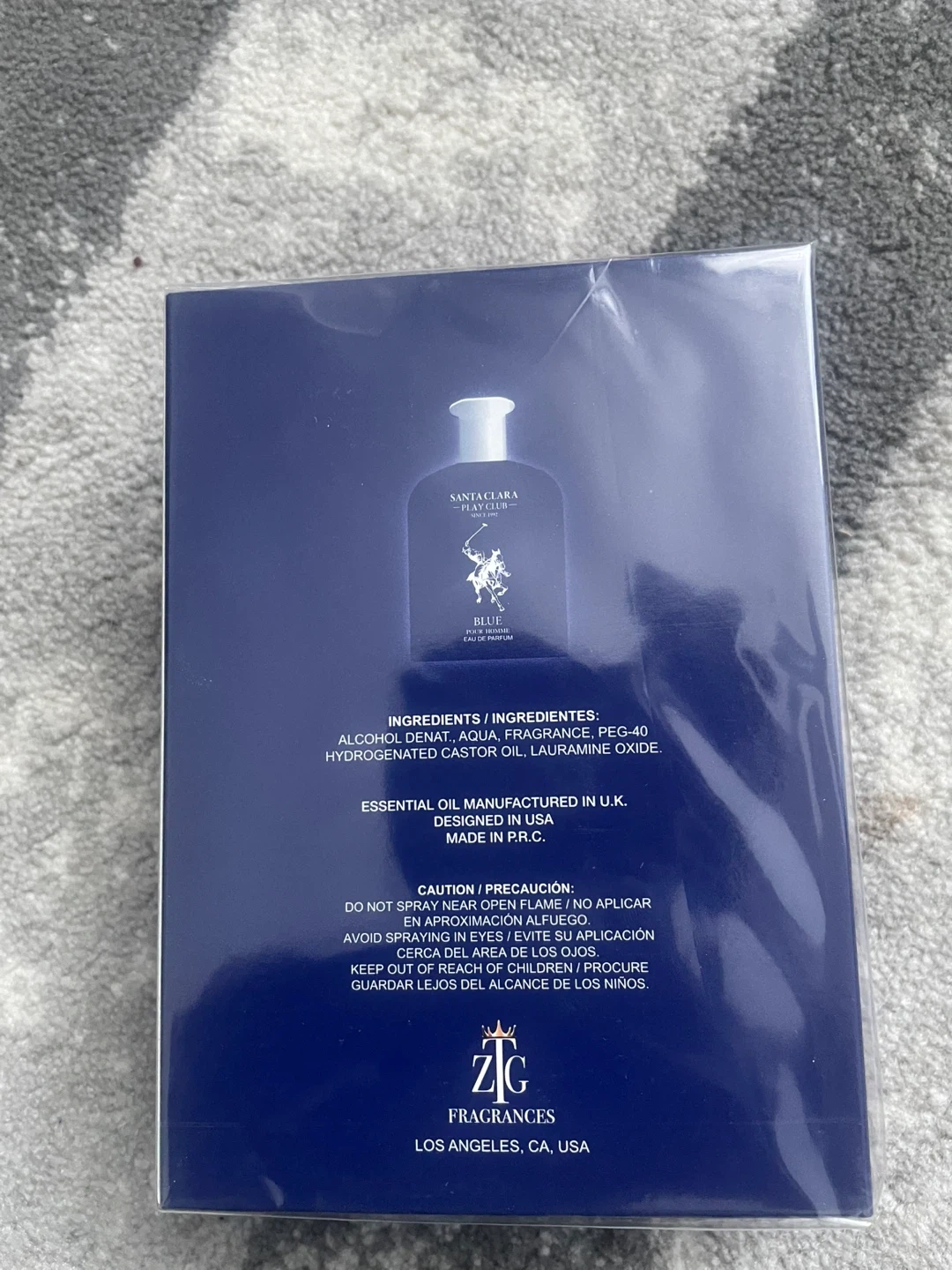 Santa Clara Play Club Blue Eau De Parfum for Men. This is a 100ml bottle of fragrance. It's made with alcohol, aqua, fragrance, PEG-40 Hydrogenated Castor Oil, and Lauramine Oxide. The scent is manufactured in the U.K.