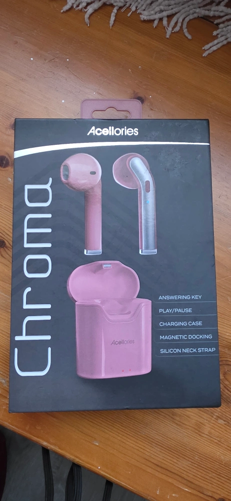 Selling a pair of Acellories Chroma earbuds in pink! They come with a charging case, magnetic docking, and a silicon neck strap. The box is included too!
