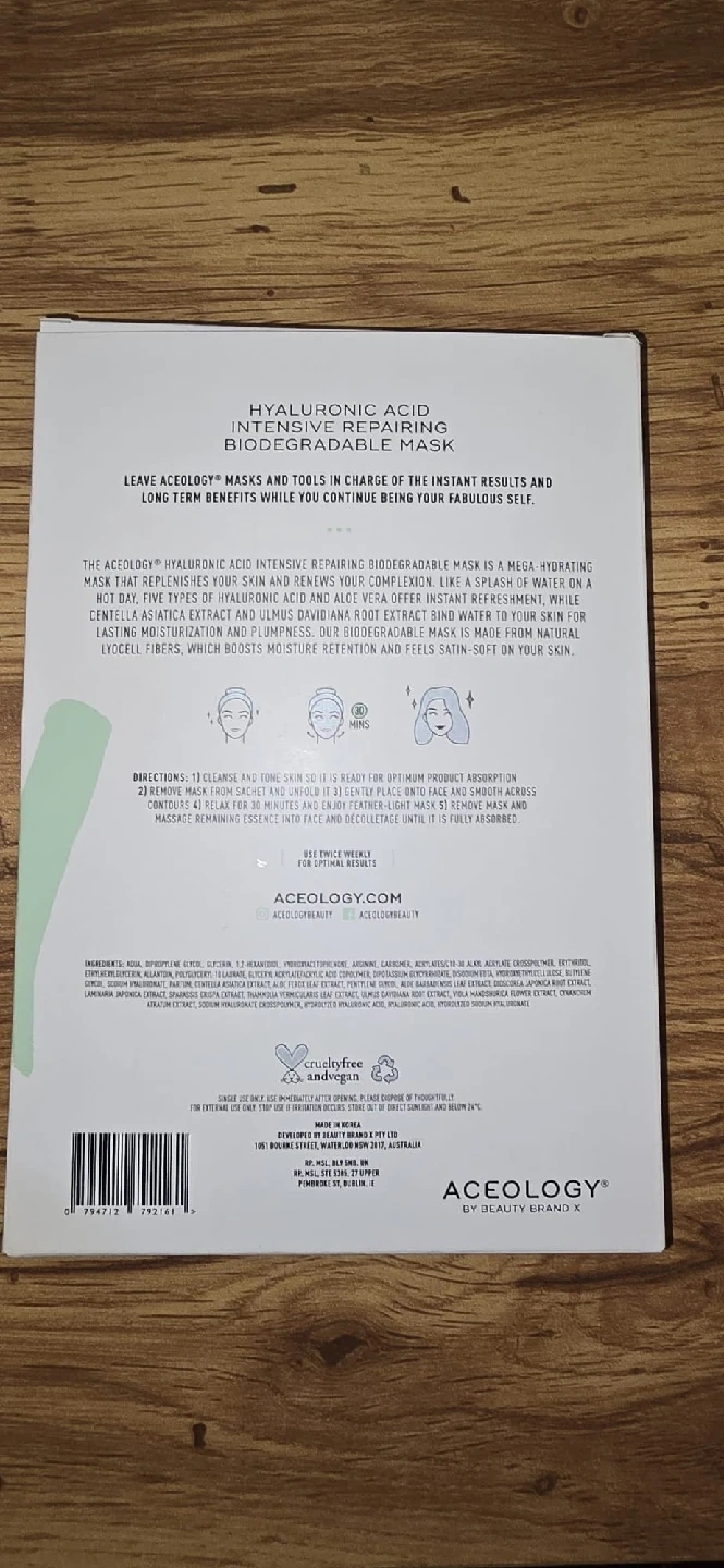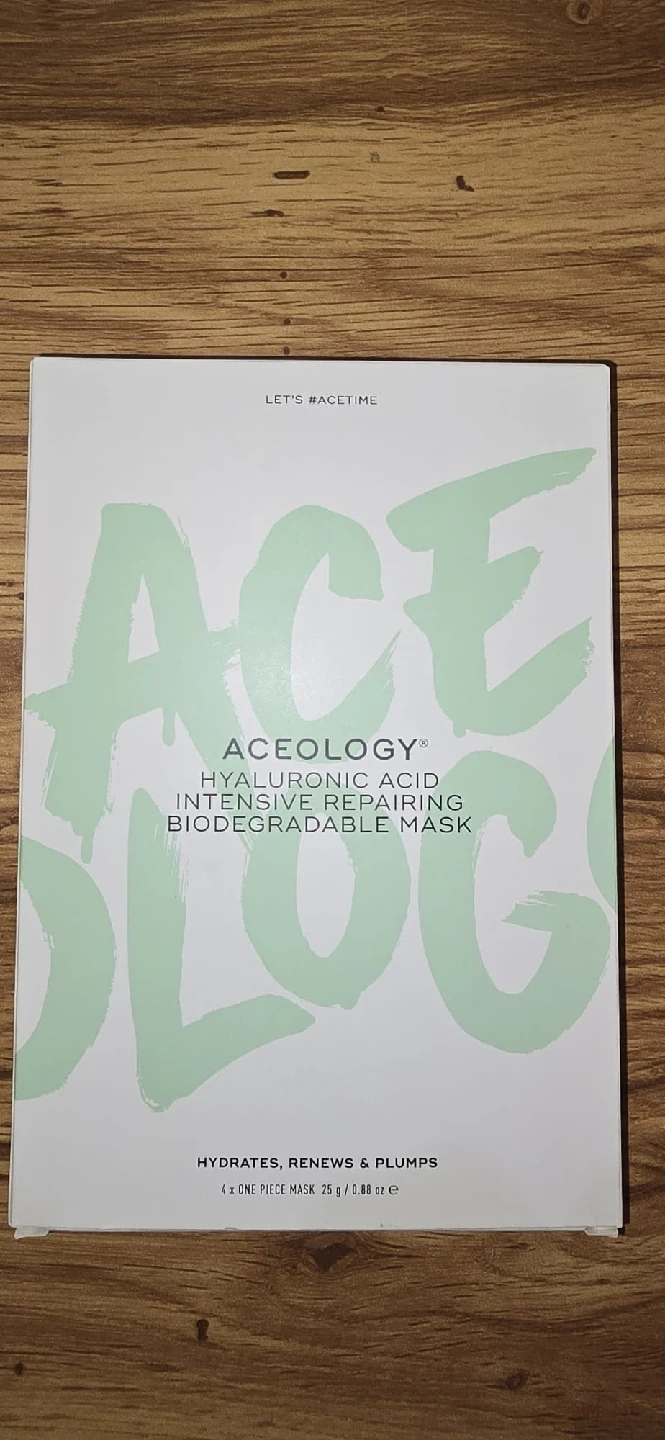 30I have a brand new box of Aceology Hyaluronic Acid Intensive Repairing Biodegradable Masks! This mask hydrates, renews, and plumps the skin. Each box contains 4 one-piece masks (25 g / 0.88 oz e).