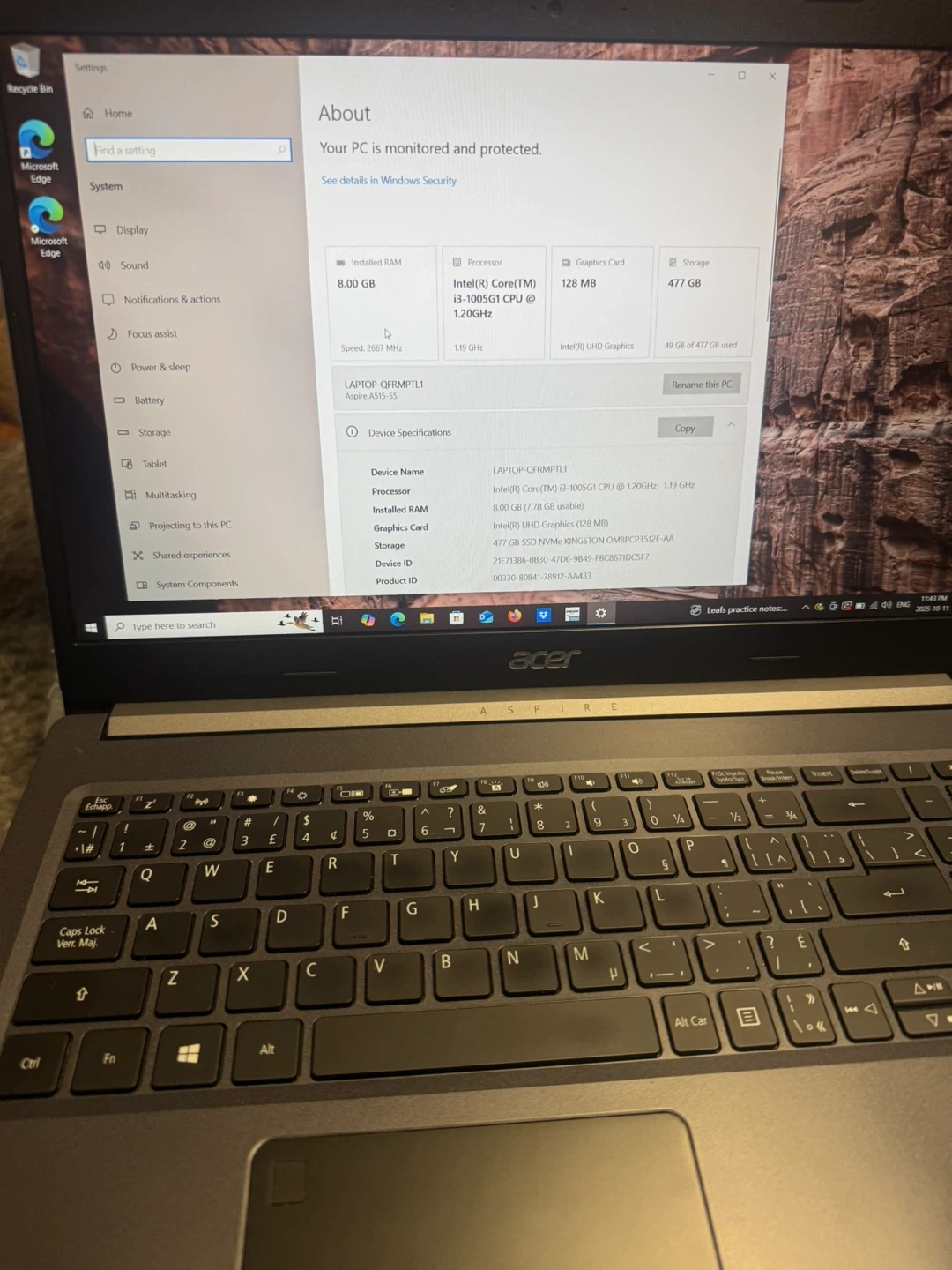 Acer Aspire i3 Laptop 500 GB storage 1.20 GHz 8 GB installed RAM 128 MB graphic card Selling an Acer Aspire laptop with windows installed, comes with a charger. It's in excellent working condition no issues. !