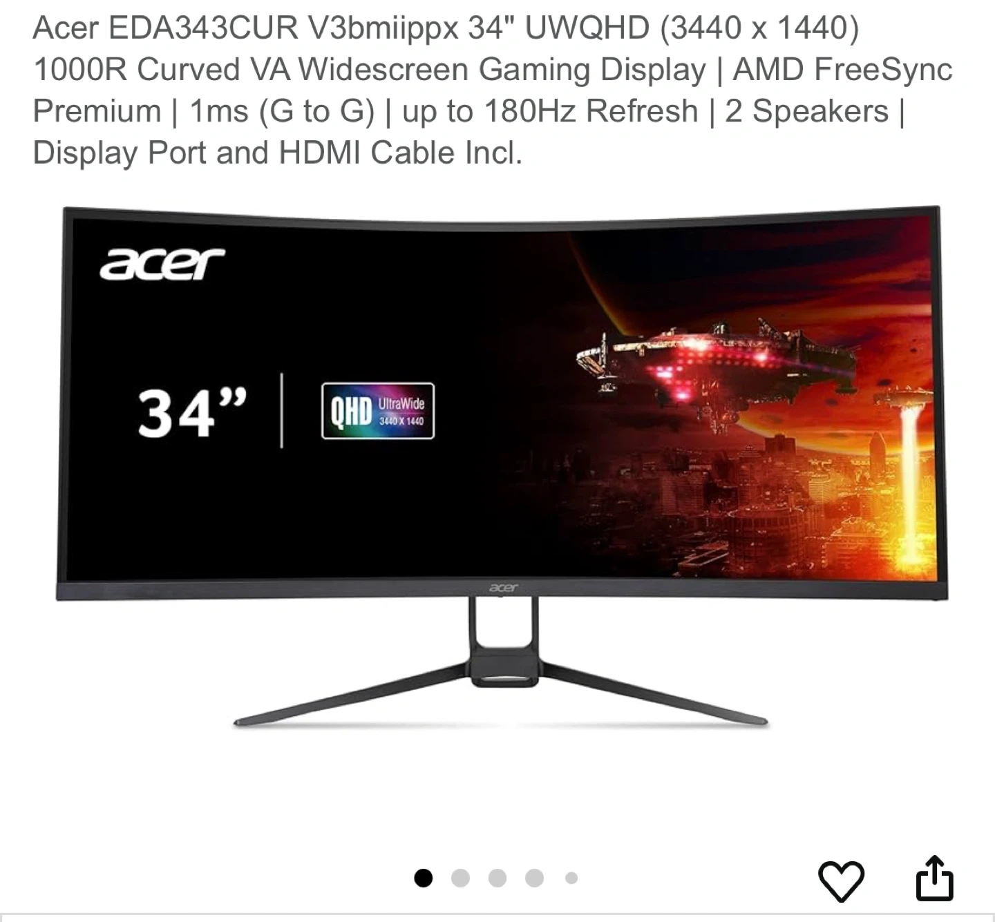 Looking to sell my Acer EDA343CUR V3 34" curved gaming monitor! It has a 3440 x 1440 resolution and up to 180Hz refresh rate. Key features: - 1000R Curved VA Widescreen Gaming Display - AMD FreeSync Premium - 1ms (G to G) response time - 2 Speakers - Display Port and HDMI Cable Included