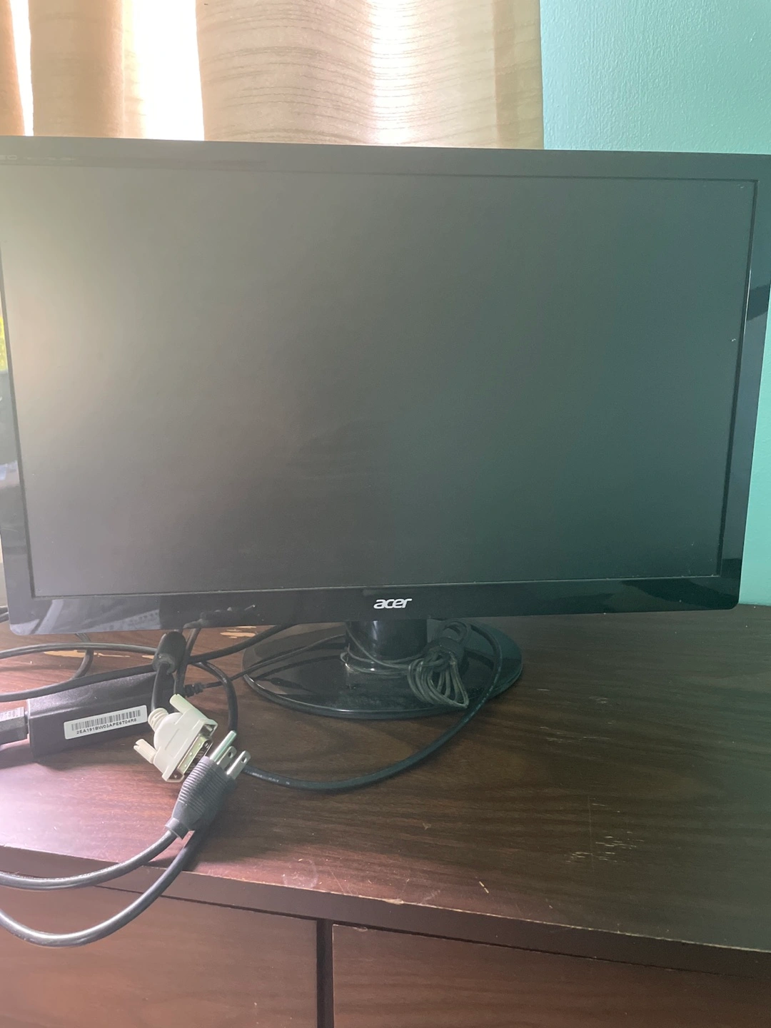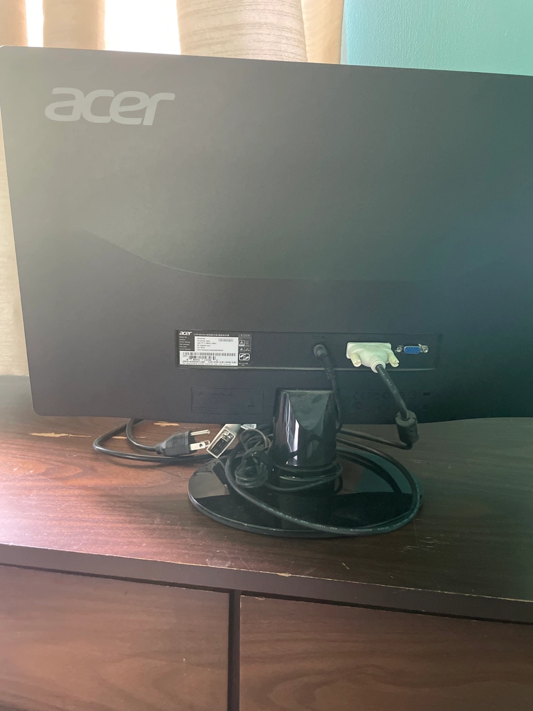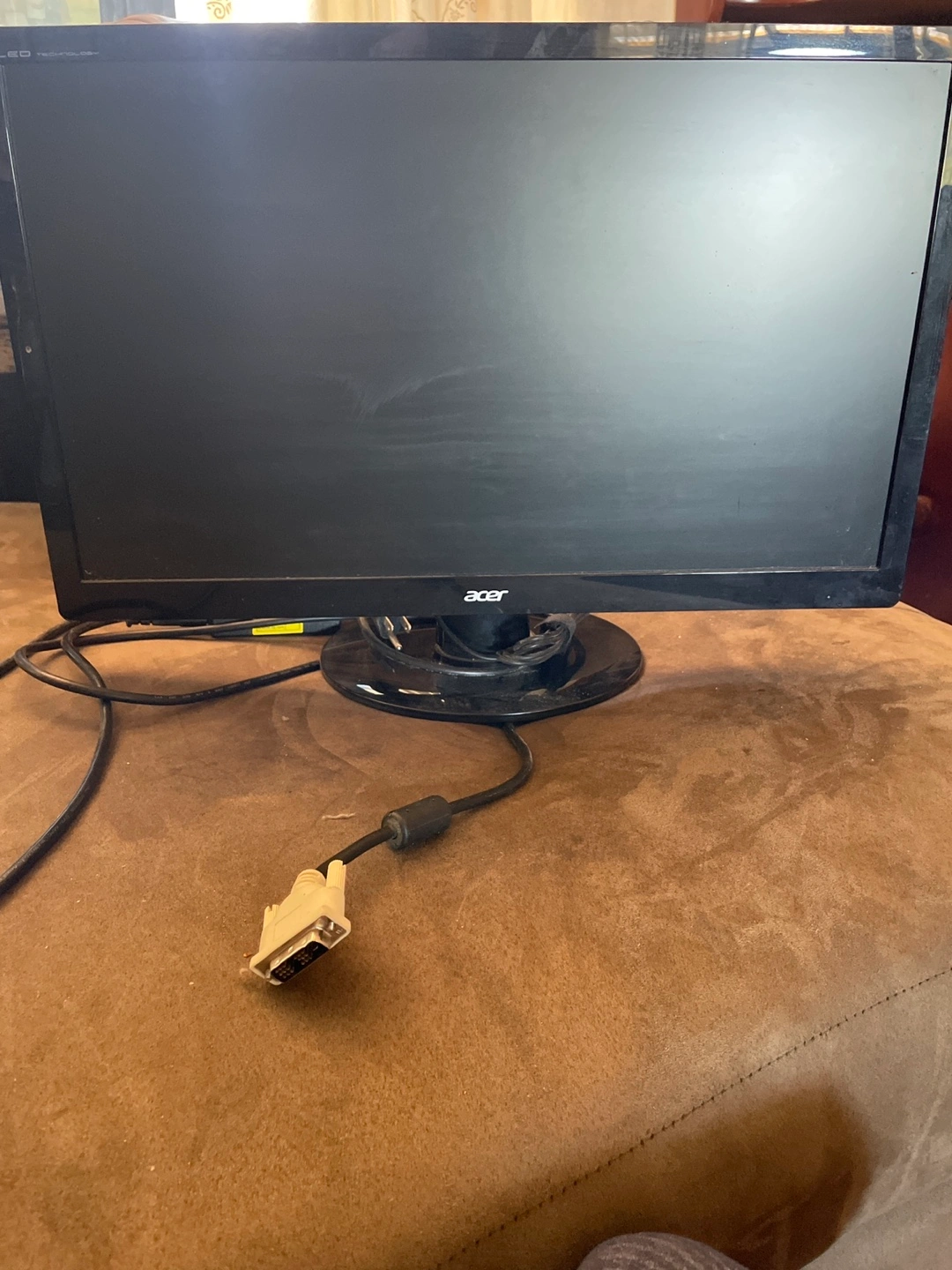 15A black computer monitor. (20” x 12” ) Has a circular base with a long cable. The back of the monitor has (old school connection) multiple connection ports. Still works