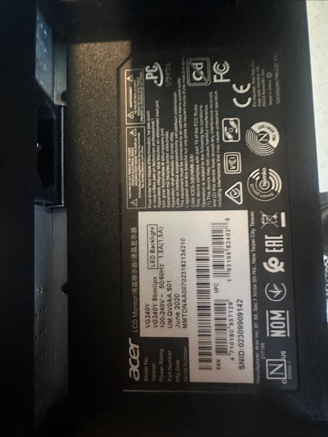 68Selling an Acer VG240Y Sbmiipx monitor. It's a 24-inch LED backlight display. The manufacturing date is June 2020 Screen Size: 23.8" Display technology: VA Screen Resolution: 1920 x 1080 Interface: 2 x HDMI, 1 x DisplayPort Contrast Ratio: 3,000:1 16.7M 178 deg(H) x 178 deg (V) Ratings and certifications: MPR II Without built-in speakers Weight: 8.49 lbs 12.7" H x 21.3" W x 2.6" D Used it few times now im moving out i can add my hdmi cable with it Brand new costs200$ plus