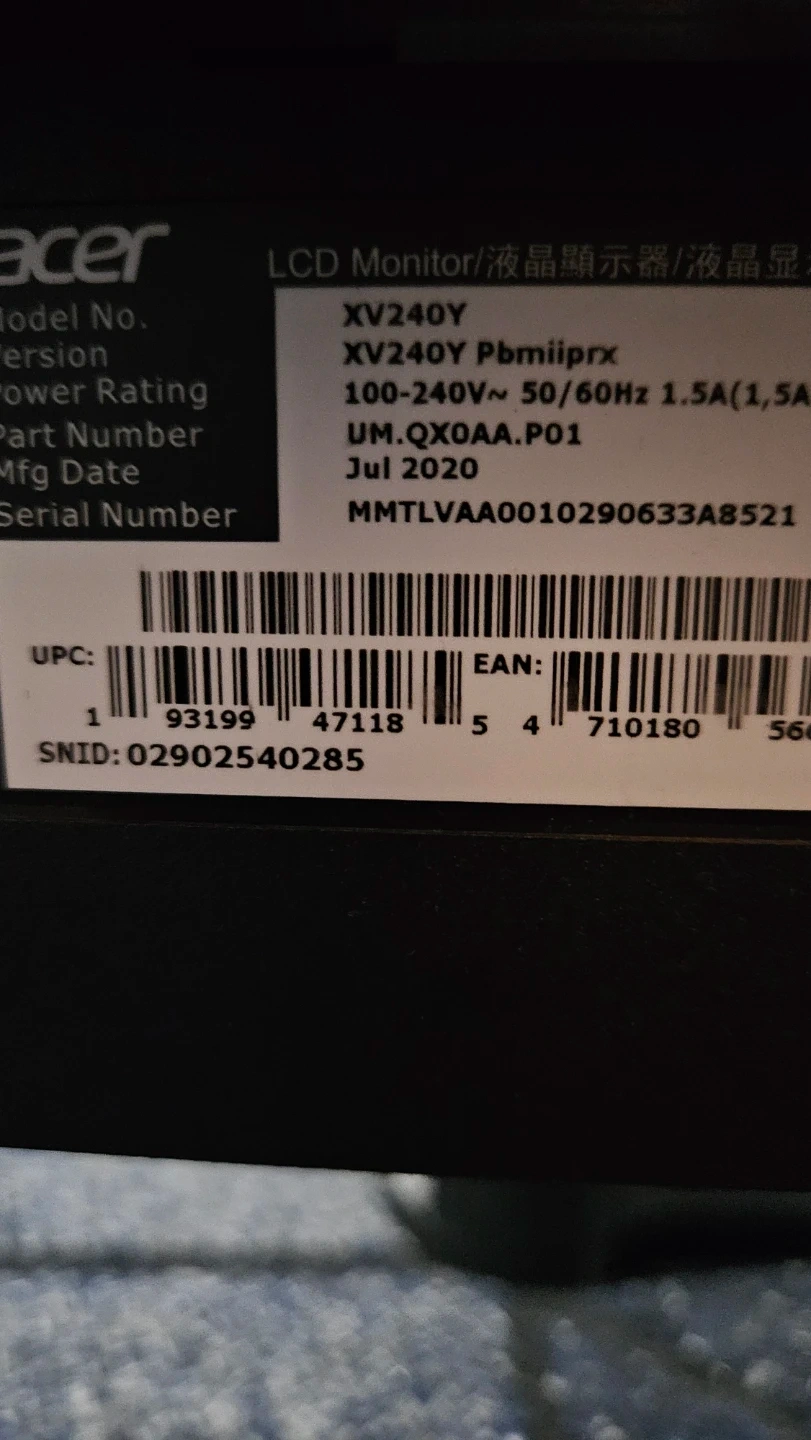 10Selling an Acer LCD monitor, model XV240Y Pbmiiprx. It's in good condition and ready for a new home! Mfg Date Jul 2020. Has not been in use since beginning of year. Smoke free and pet free home.
