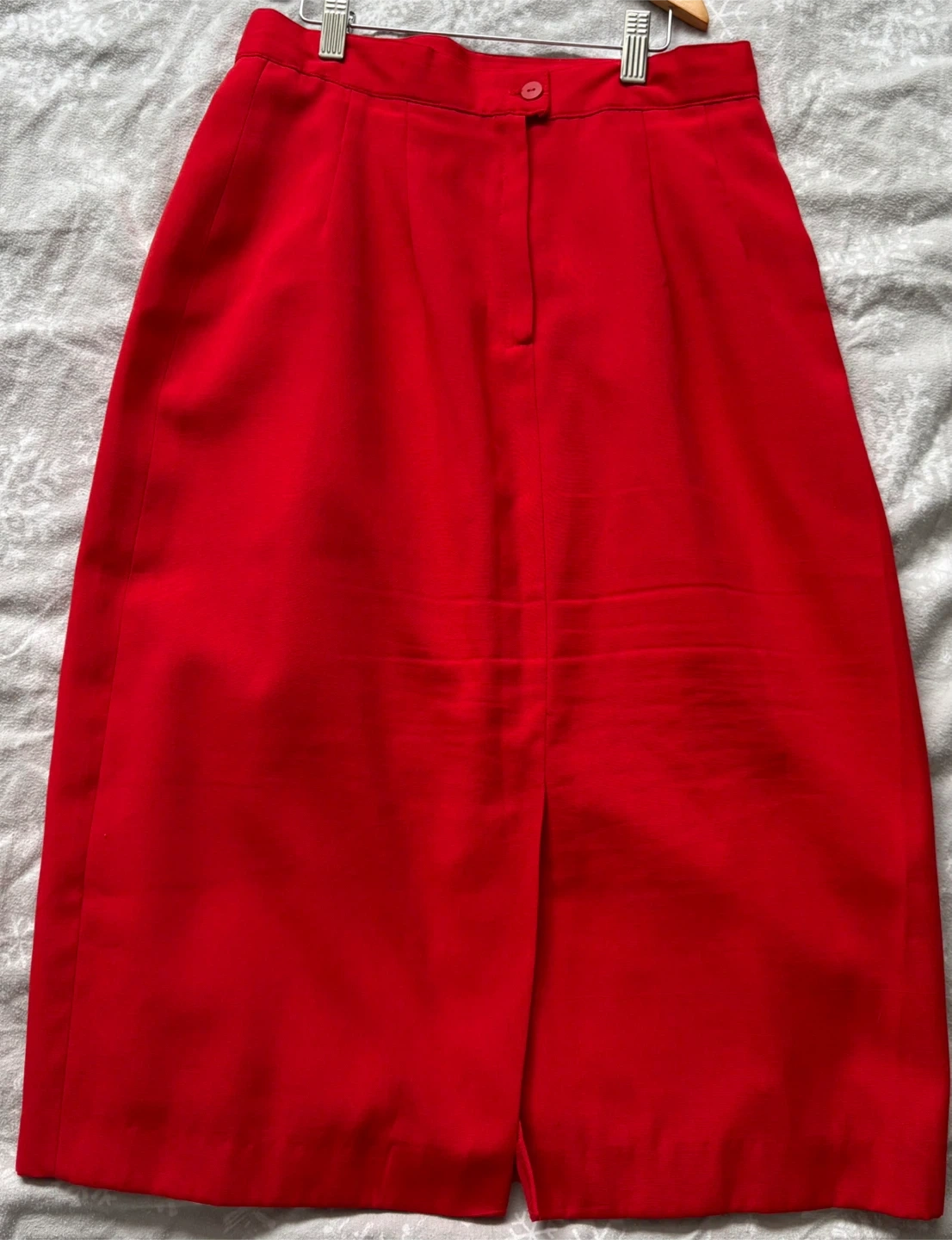 A vibrant red knee-length skirt with a button and zipper closure. It features a silky smooth lining for comfort. This classic A-line style skirt has a subtle slit at the front for ease of movement.
