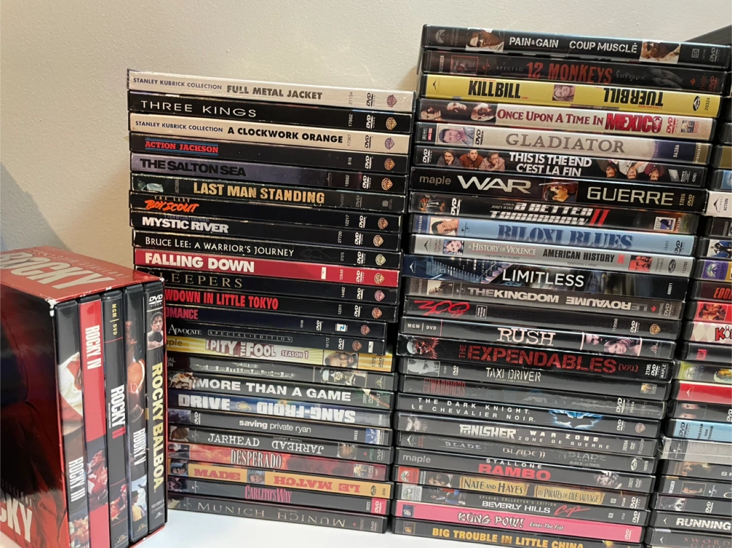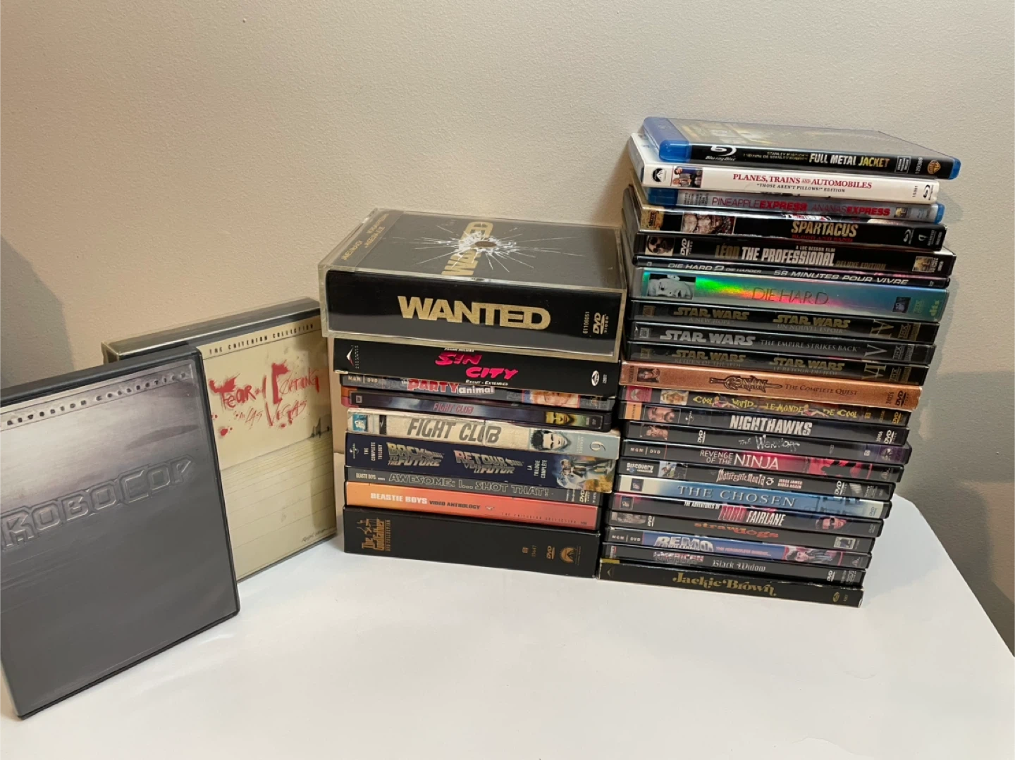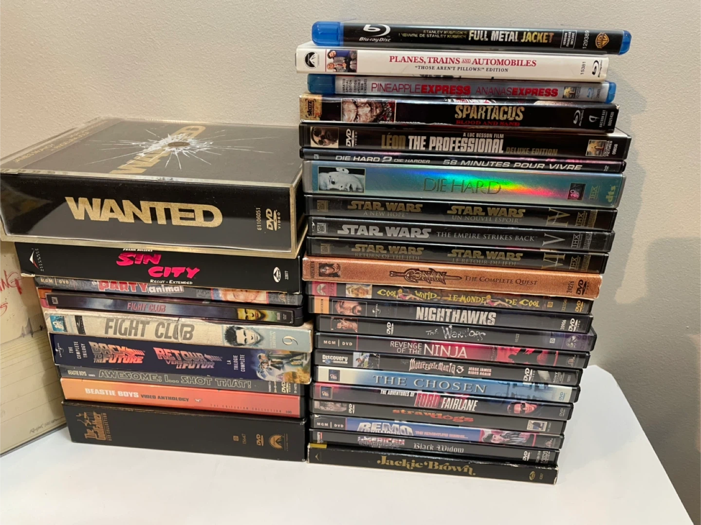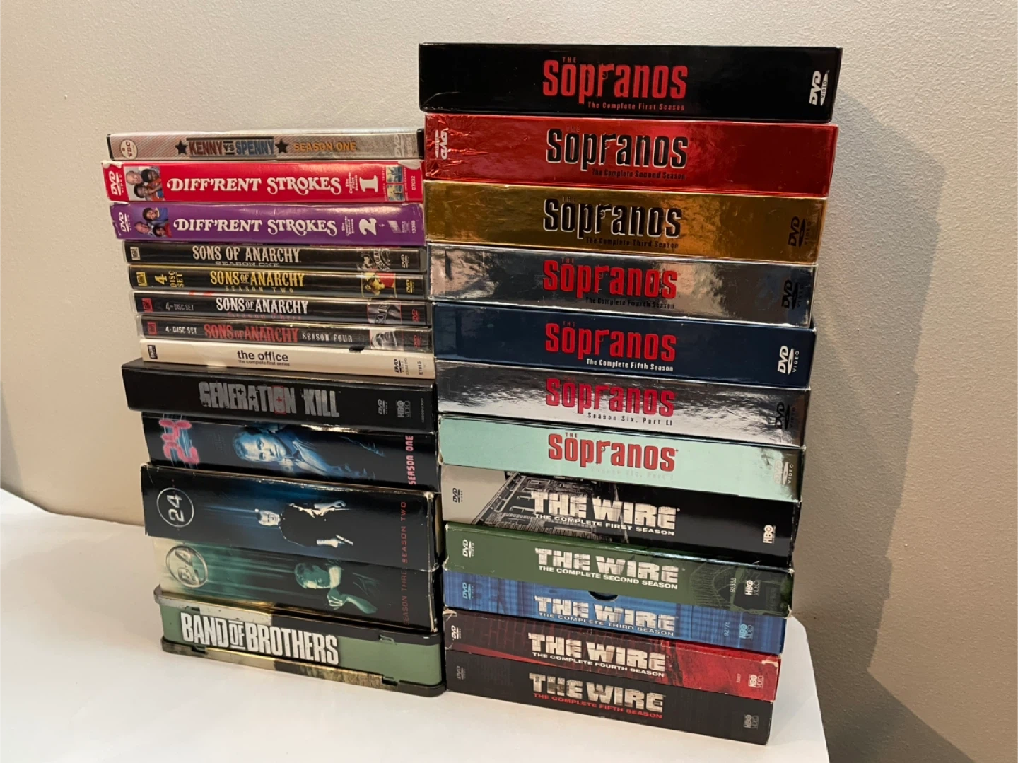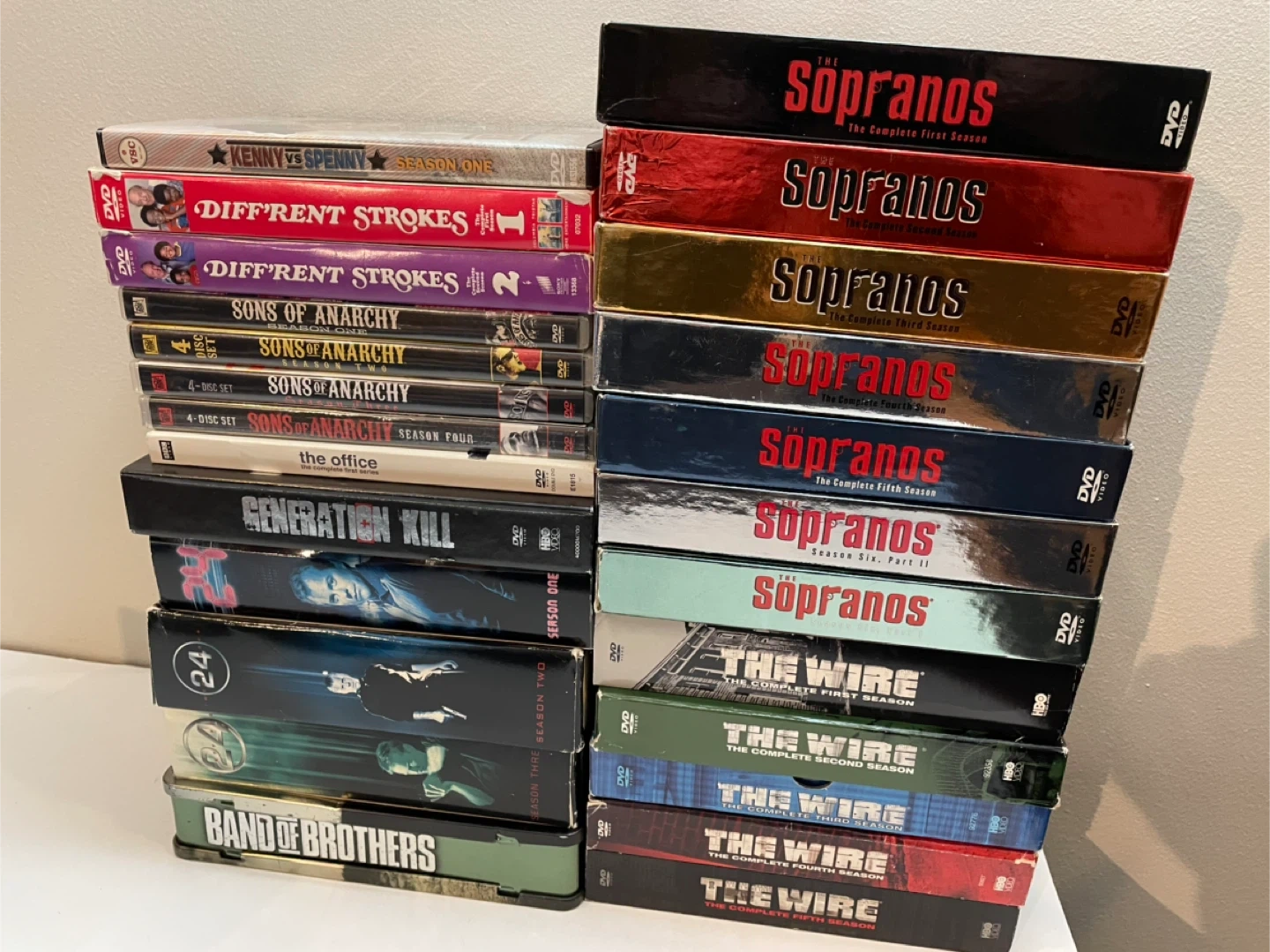 Collection of DVDs including complete seasons of The Sopranos and The Wire, plus many popular movies. Includes various TV series seasons and standalone films. A great set for any movie or TV enthusiast! 2.50 and up .