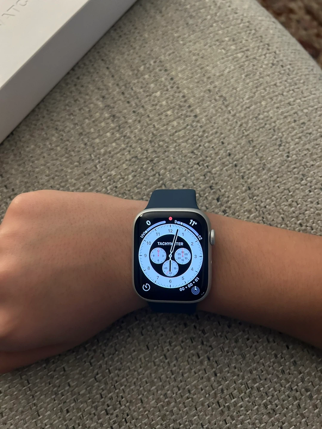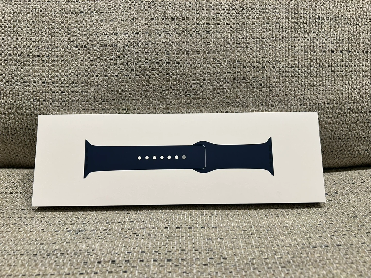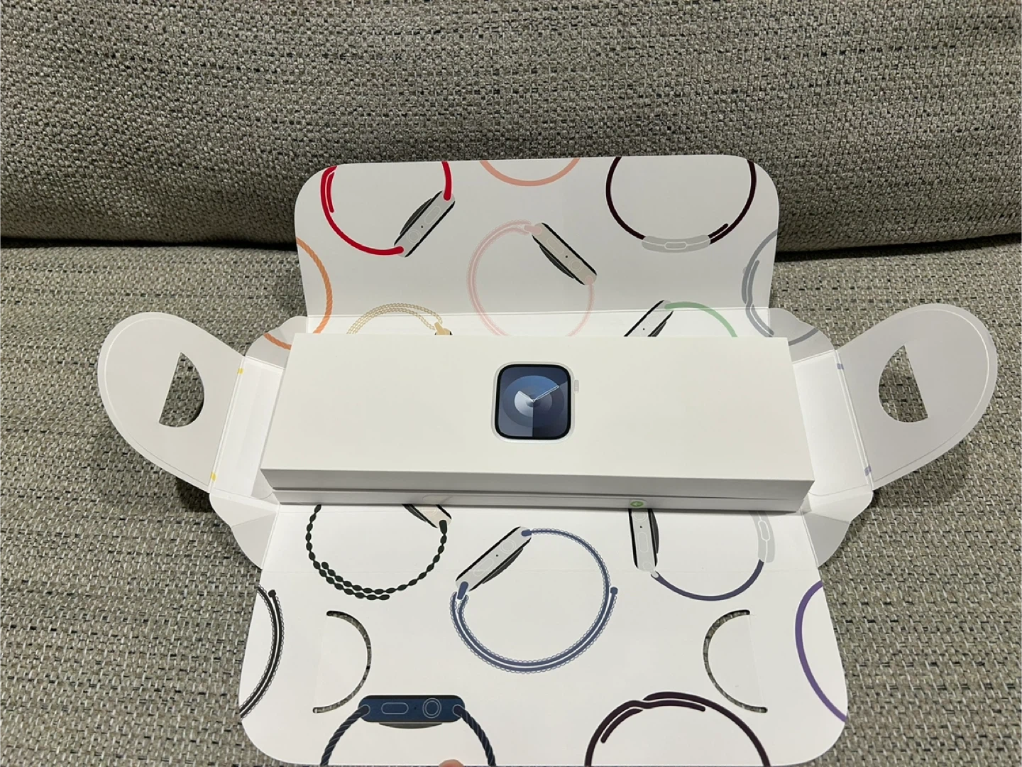 Apple Watch Series 9 in Storm Blue. This is a sport band. It comes with the original box. Designed by Apple in California.