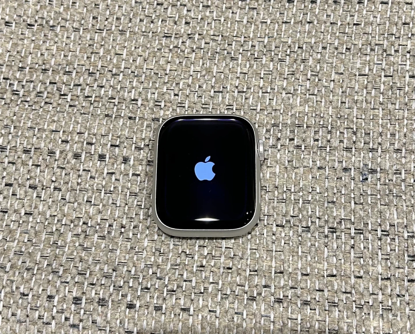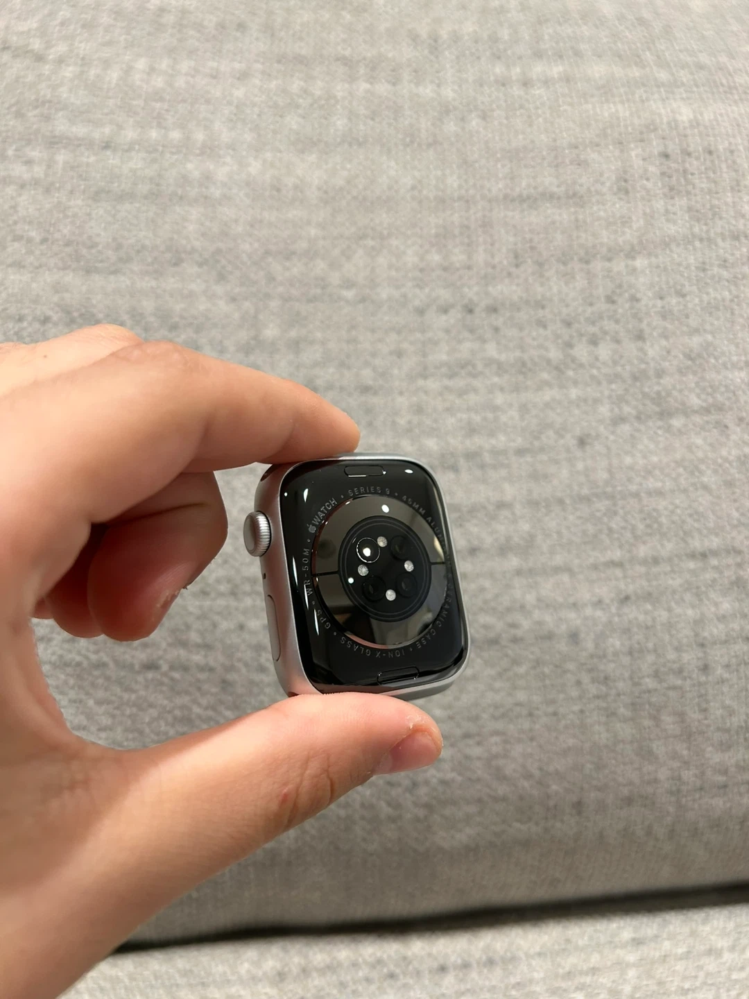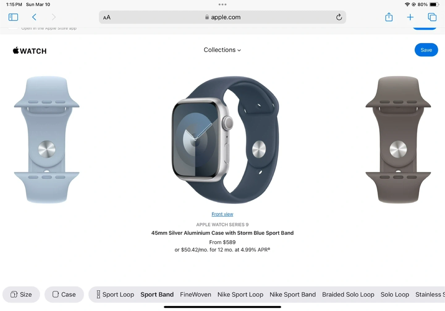 Apple Watch Series 9 in Storm Blue. This is a sport band. It comes with the original box. Designed by Apple in California.