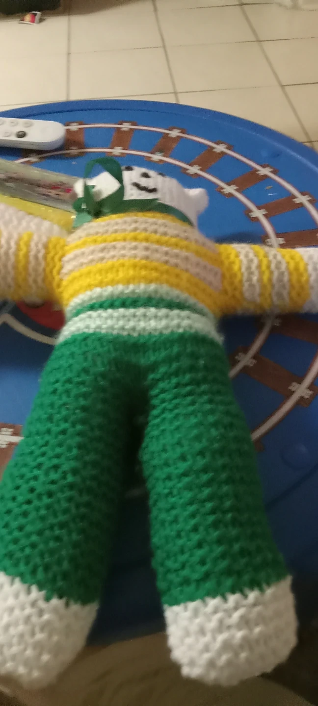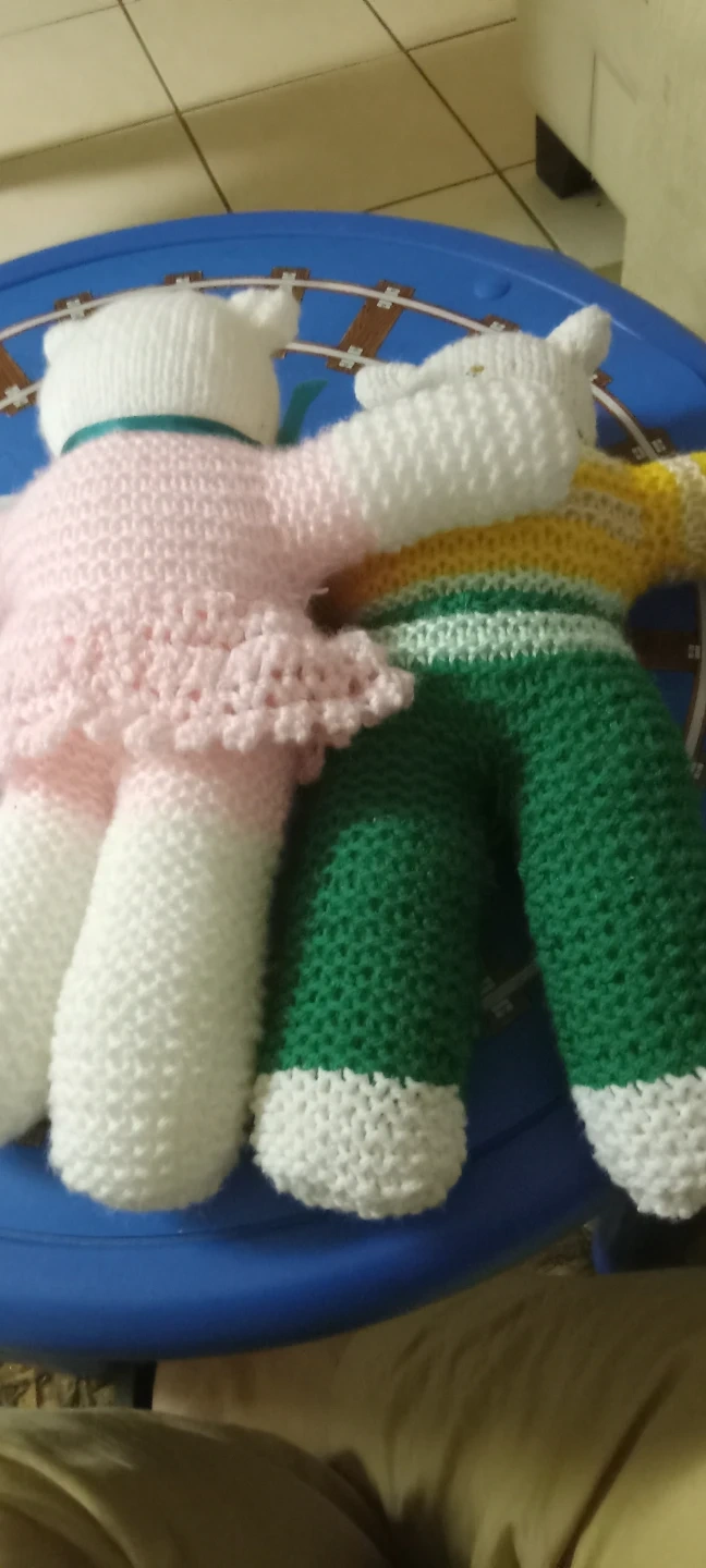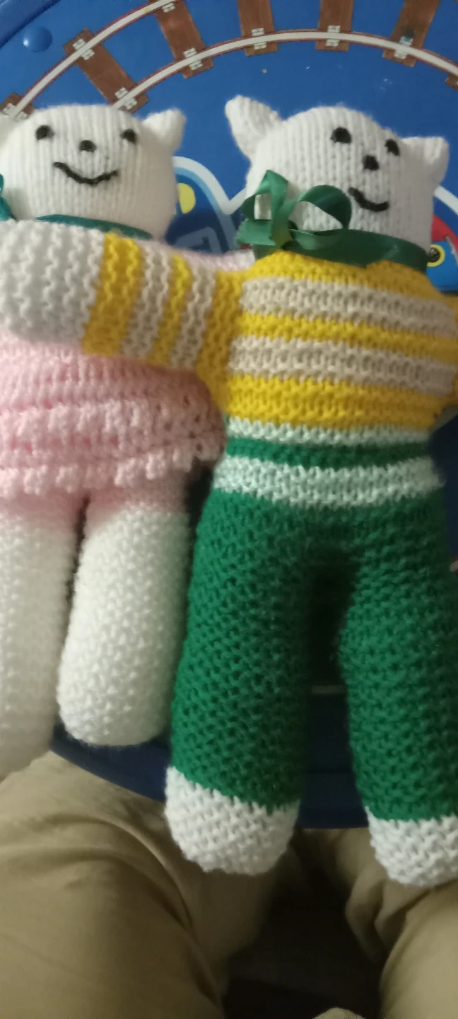 Two adorable hand-knitted stuffed animals. One has a pink dress and white legs. The other wears a yellow, green, and white striped shirt with green pants and white cuffs. Both have white heads with stitched smiles and green ribbon bows. These huggable toys are perfect for playtime!
