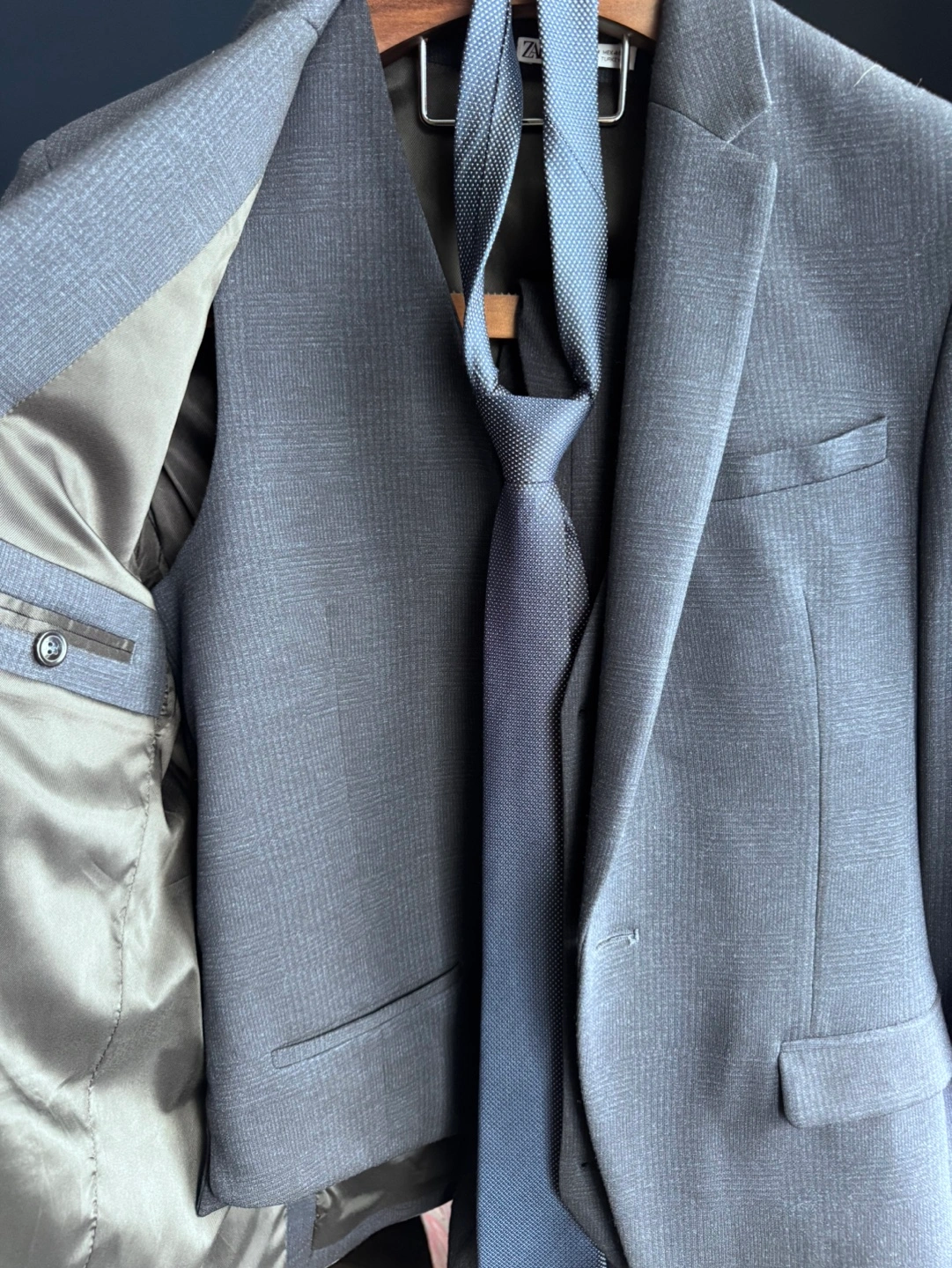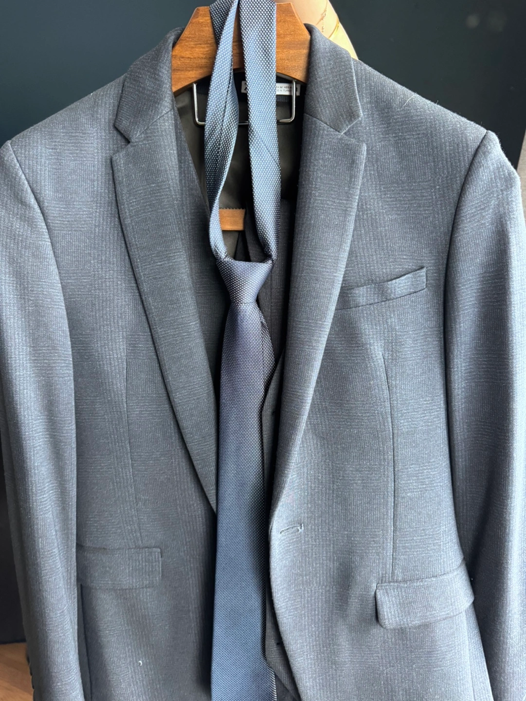 Men's three-piece suit. Includes jacket, vest, tie, and trousers. Dark navy blue colour, with a subtle hatch pattern. Four-way stretch material. Used once for wedding, excellent condition. Size M.