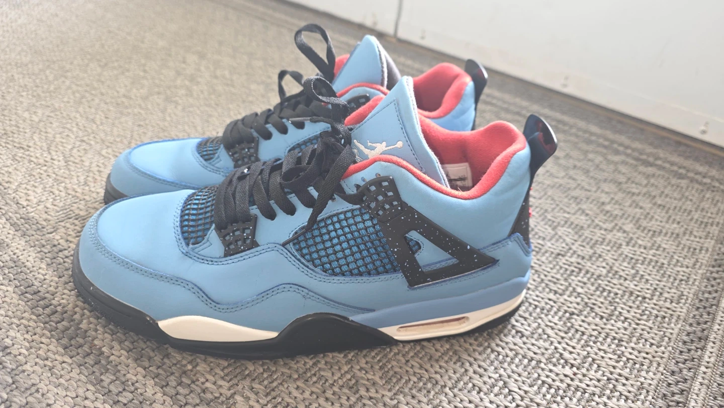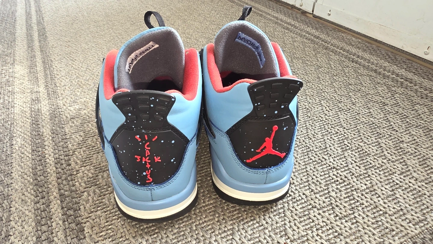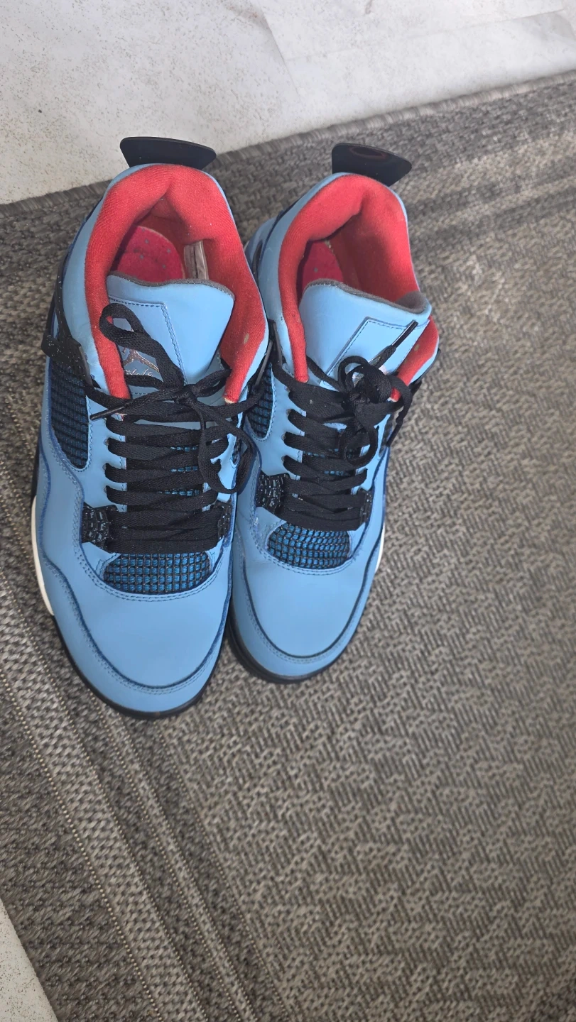 These are the Air Jordan 4 Retro Travis Scott Cactus Jack sneakers. They feature a light blue nubuck upper with red accents. The signature "Cactus Jack" detailing is present on the heel.