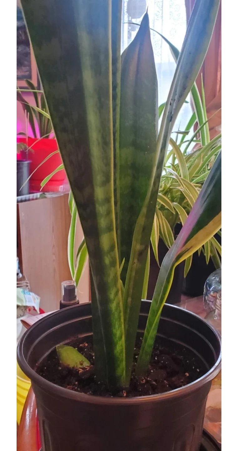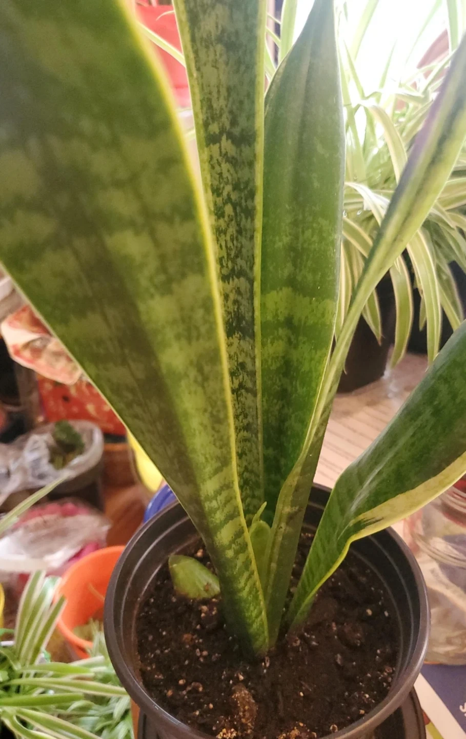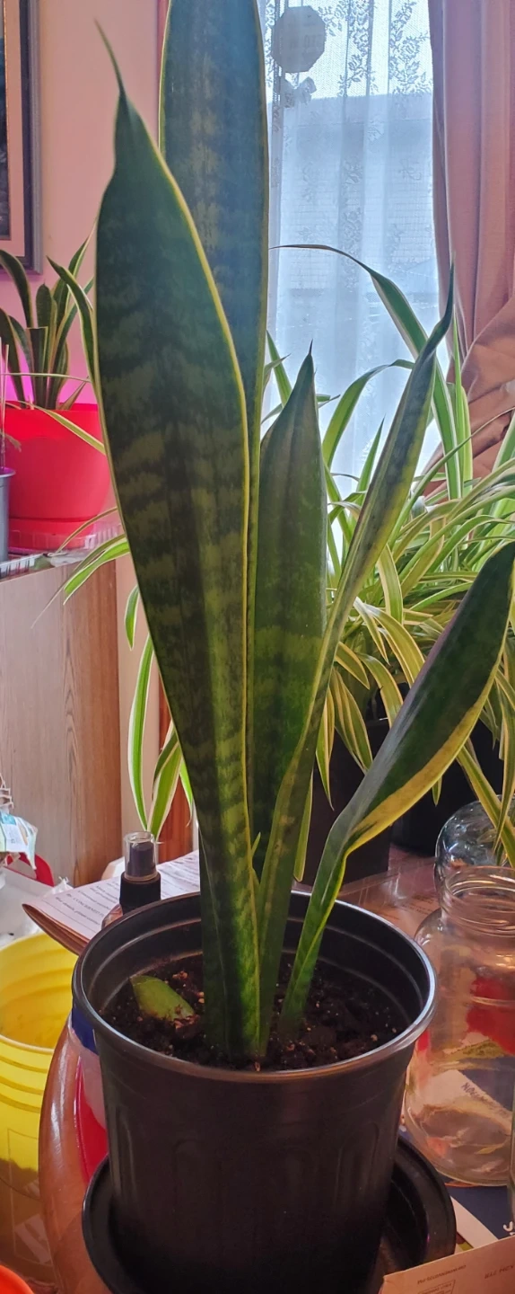 A healthy Snake Plant in a dark brown pot. It's known for its air-purifying qualities. This plant thrives in various light conditions.