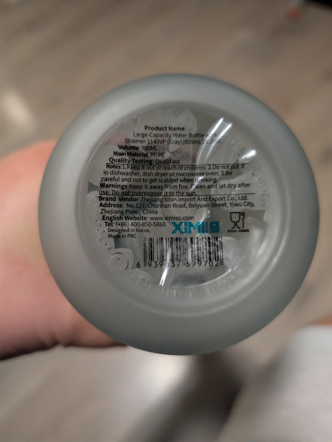 Selling a XIMISO large-capacity water bottle with a strainer! It's grey, holds 800ml (28.2fl oz), and is made of PP and PC material. Perfect for staying hydrated on the go