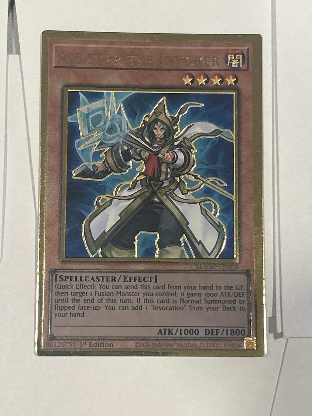 Selling an Aleister the Invoker Yu-Gi-Oh! card. It's a Spellcaster/Effect monster with 1000 ATK and 1800 DEF. Add 'Invocation' from your Deck to your hand!