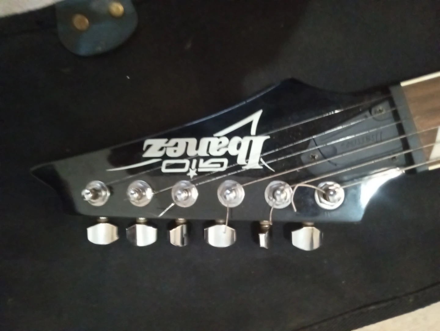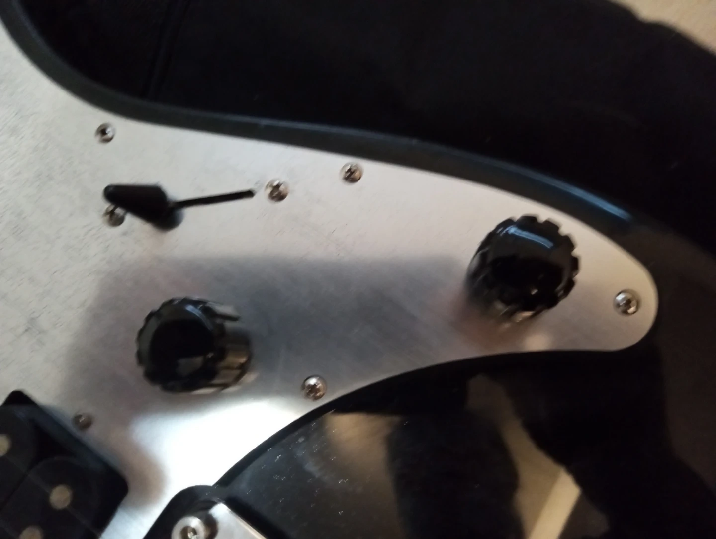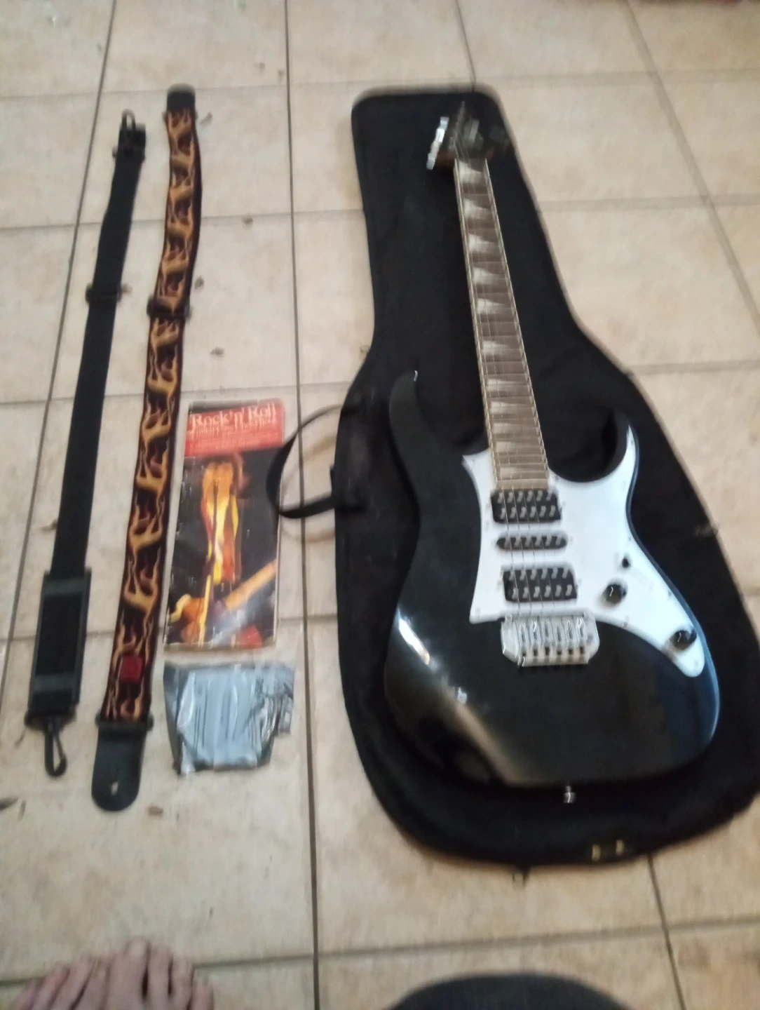Black electric guitar with a silver pickguard and bridge. It comes with a gig bag, a strap, and a "Rock 'n' Roll" instructional book. Serial number is J101250183. Message through carrot 1908 Gerrard e 204