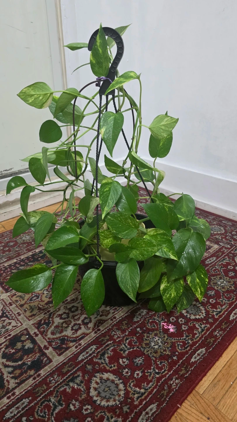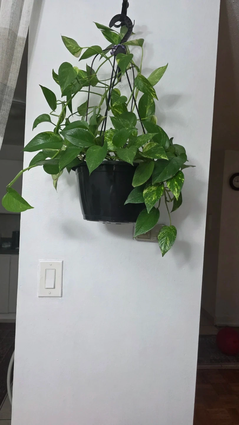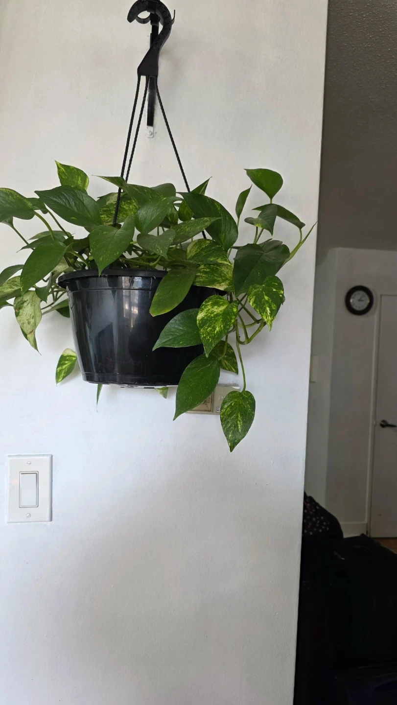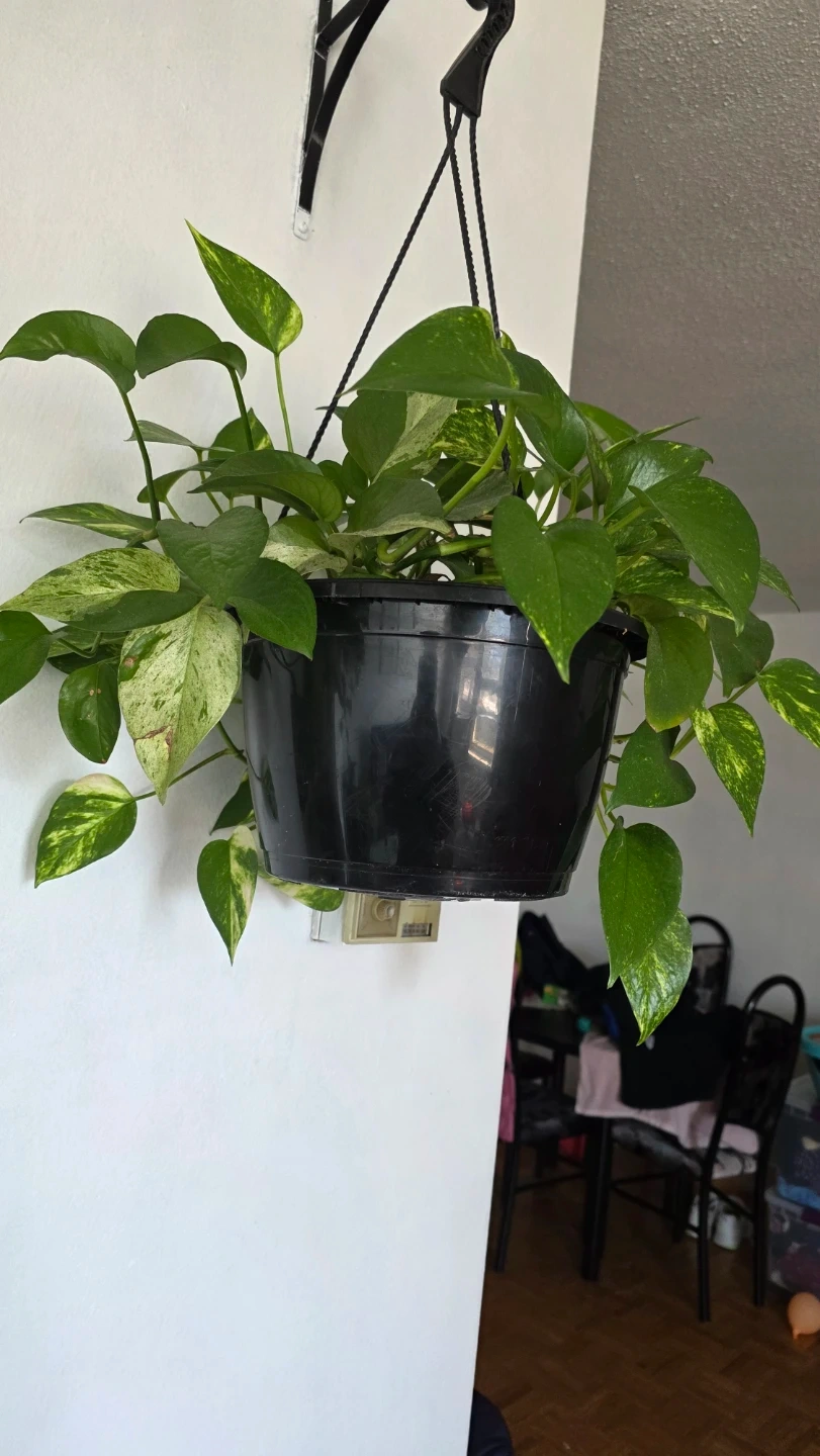 A healthy Pothos plant in a black plastic hanging pot. It's a lovely trailing plant with variegated green and yellow leaves. Easy to care for, it adds a touch of green to any space! This plant is great for improving air quality.